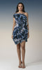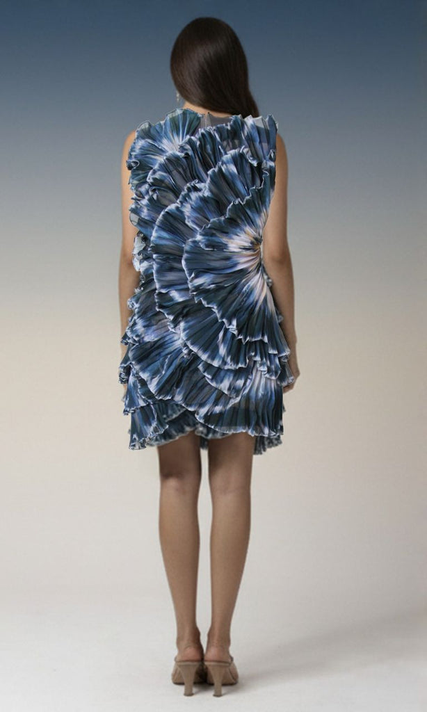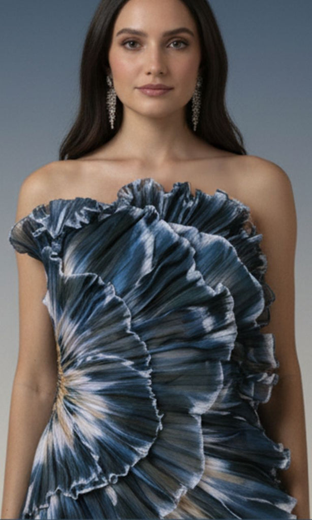 A striking one-shoulder mini dress crafted with an artistic abstract print in deep oceanic hues. Designed with sculpted, pleated ruffle detailing that radiates from the bodice, this statement piece creates dramatic texture and movement. The asymmetrical silhouette highlights the neckline while the fitted shape enhances the form with modern elegance. Bold yet refined, it’s perfect for cocktail parties, upscale dinners, fashion-forward events, or evening celebrations where standout style is essential.
