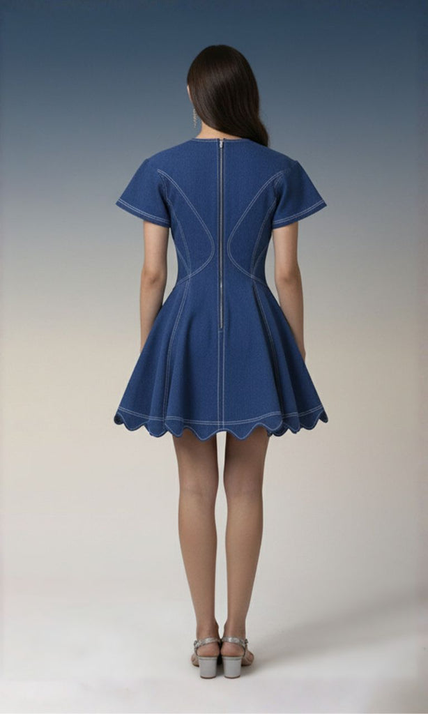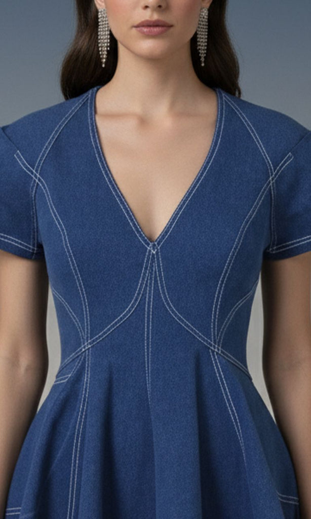 A chic blue mini dress featuring a deep V-neckline, structured panel stitching, and a flared skater-style hem. The silhouette is feminine and playful, offering a modern, stylish look perfect for casual outings or evening events.