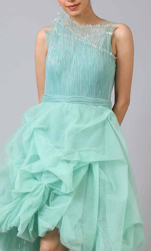 'Colleen' dress is made up of wire mesh with embellished edges. Stiff net gives it structure and drama. A perfect 'out of the box' dress for your next party!