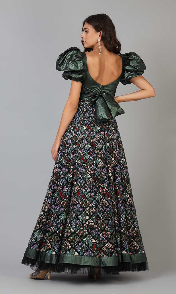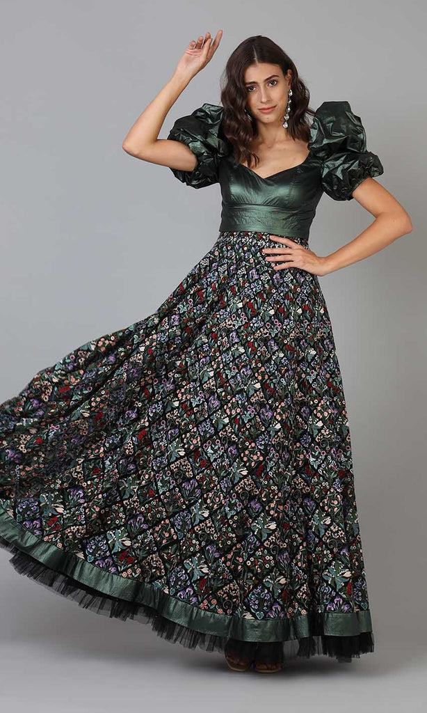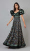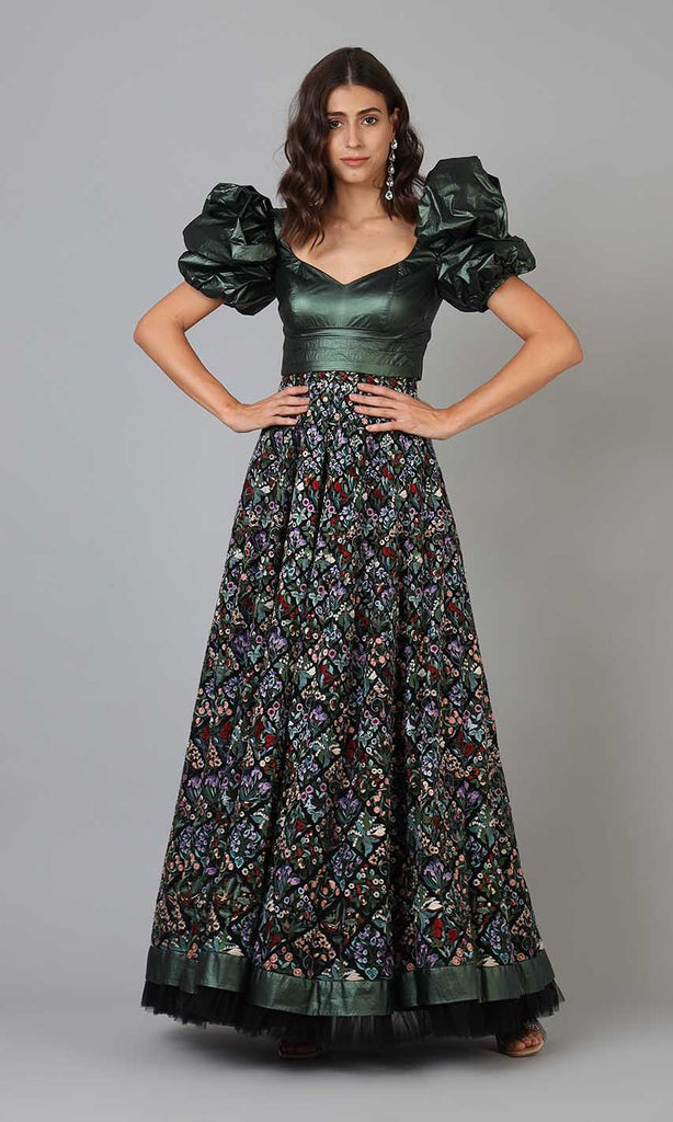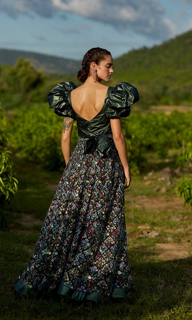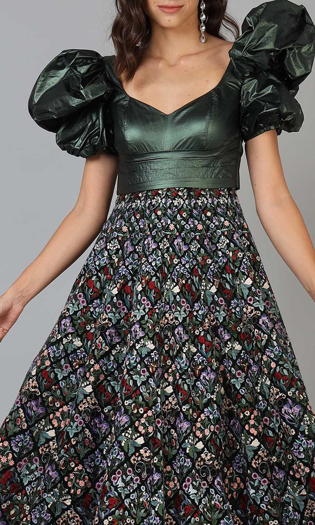 The Sylvie gown features a metallic bodice with voluminous sleeves and a floral embroidered skirt. This piece is a perfect balance of glimmer and elegance. Wear it with statement earrings and barely there heels for a sophisticated look.