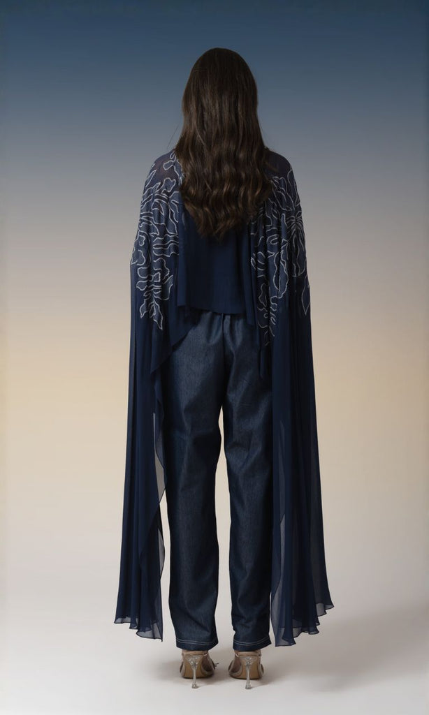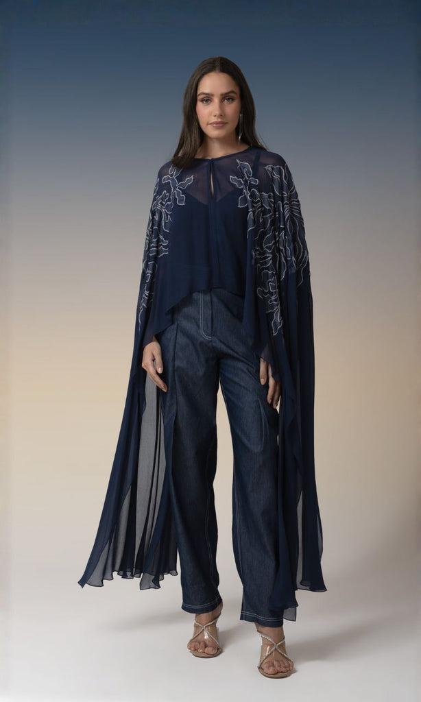 Elevate any look with our Kaylee Top, a beautifully sheer and flowing overlay crafted from lightweight navy chiffon. This dramatic piece features exquisite contrast white floral embroidery delicately detailed across the yoke and shoulder area, while the open, layered silhouette offers a graceful drape and long, airy sleeves. Perfect for adding an elegant and intricate finish to both casual and formal ensembles.