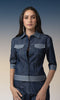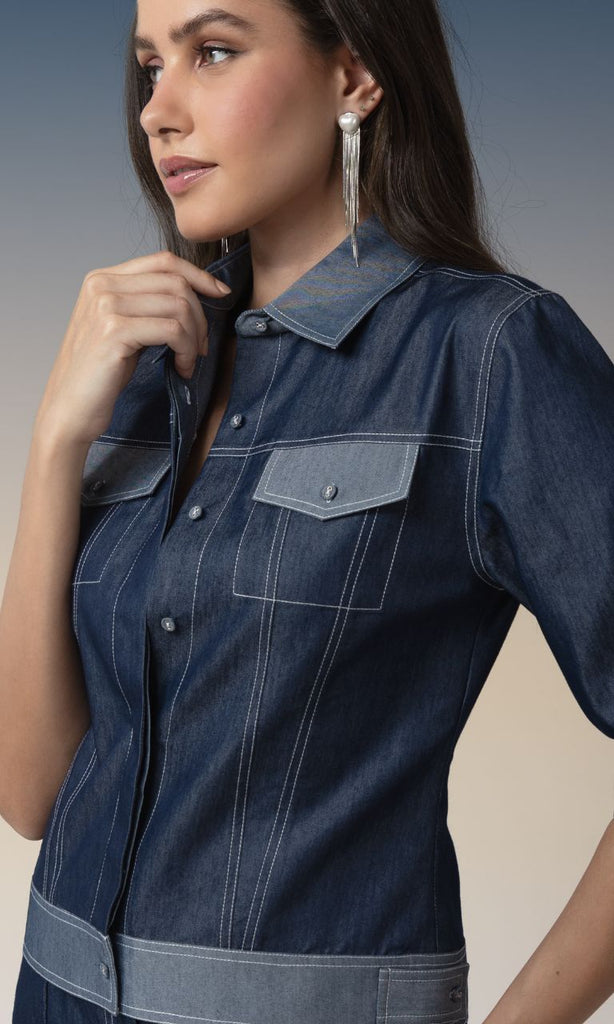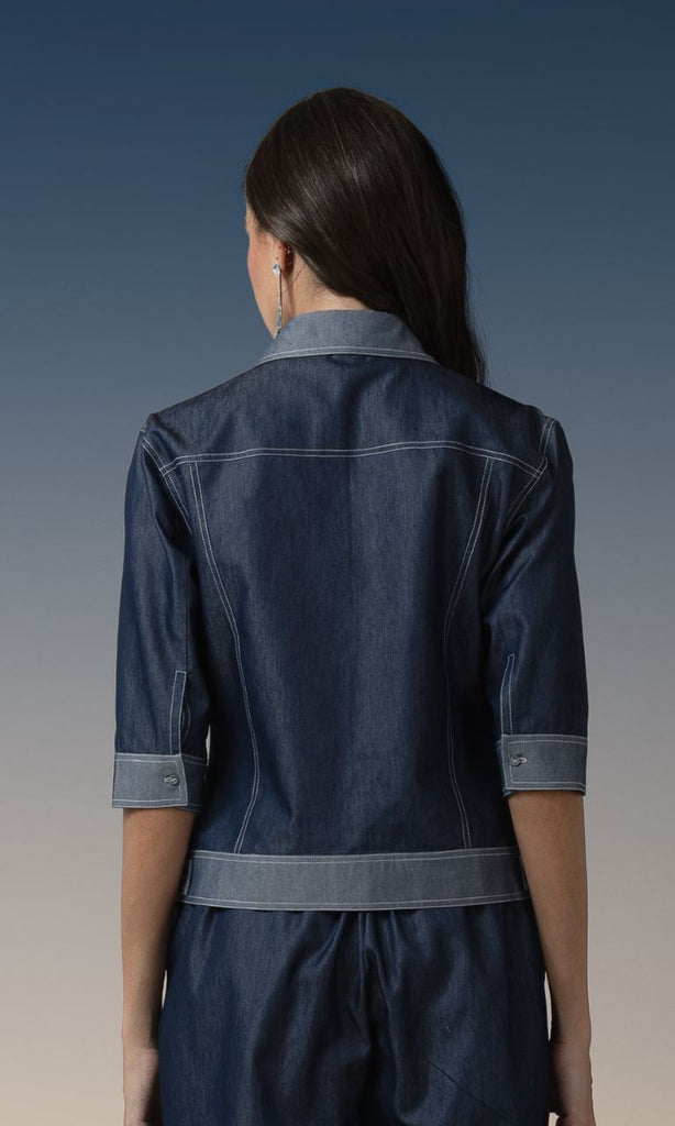 A tailored indigo denim top featuring contrast panels, triple-needle stitching, and structured details. Sleek, modern, and perfect for polished everyday dressing.