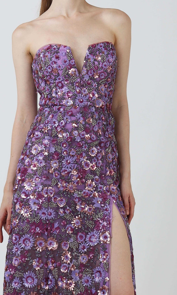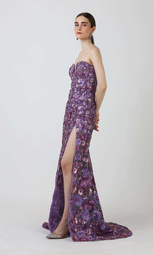 "Introducing the opulent ""Amethyst Bloom Cocktail Gown,"" a captivating masterpiece draped in a resplendent amethyst hue and embellished with  intricate floral embroidery, paying homage to the cosmic harmony of nature's elements. Unveiling with elegance, delicate petals dance across the ensemble while a daring thigh-high slit adds a captivating allure inviting the cosmos to waltz with every step. With its commanding sensuality and ethereal charm, the ""Amethyst Bloom Ensemble" extends a gracious invitation and beckons you to embrace the inner celestial goddess within, illuminating every moment with a luminous radiance.