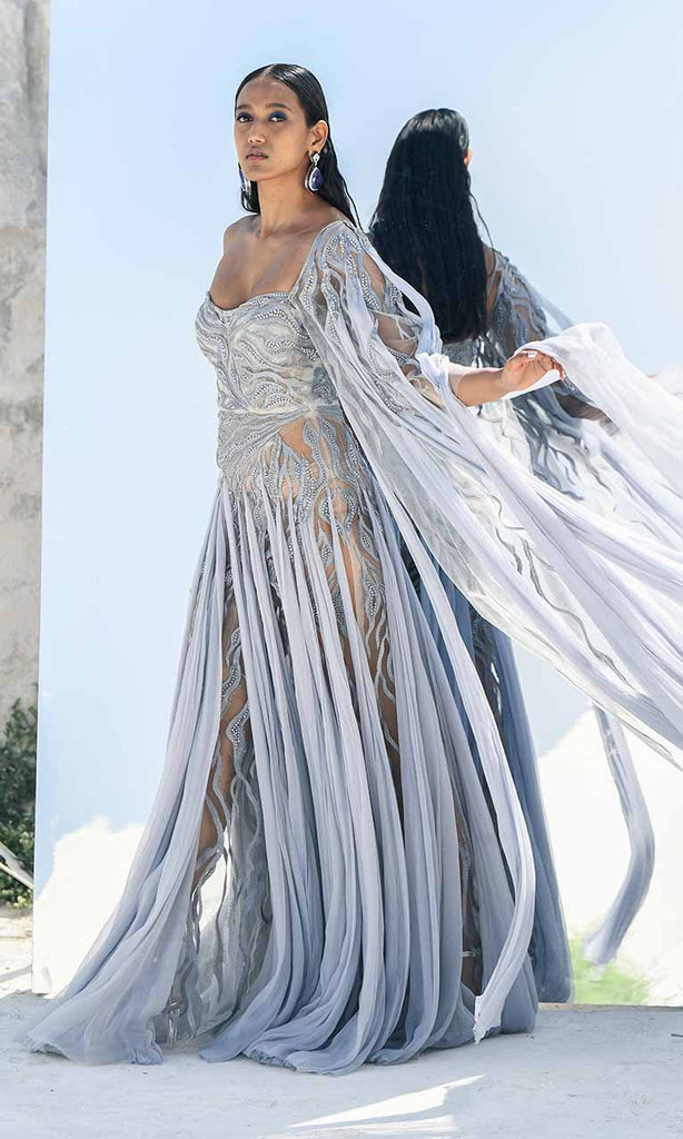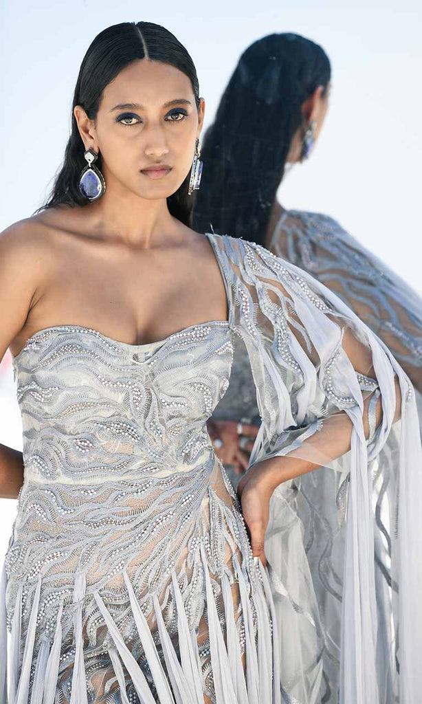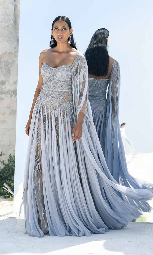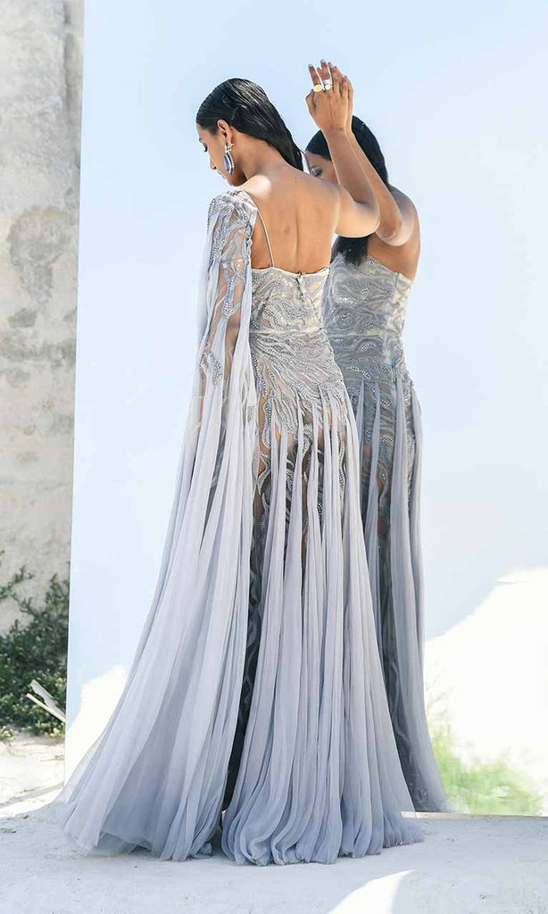 The 'Kairi' gown features a form fitted embroidered bodice with a one shoulder detail, the embroidery takes inspiration from the pattern of sea waves, the silhouette gets more sheer at the bottom, solid blue chiffon is used to achieve a feel that is similar to cascading water flowing down a hill. This outfit makes for a really romantic number and is just perfect for a milestone anniversary celebration or a dinner party, to make the look more feminine and romantic opt for tear drop diamonds along with some delicate bracelets and finish the look with your favorite scent.