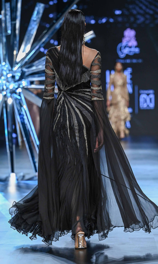 The Neva Black Gown is a chiffon masterpiece, radiating elegance. Its embroidery gracefully begins at the waist, extending into ruched chiffon and cascading frills. The embellishments take inspiration from the complex textures of black silver metallic crystals, creating an abstract motif. Completing the ensemble are elongated chiffon sleeves and striking embroidery, ensuring your entrance at any special occasion is nothing short of remarkable.