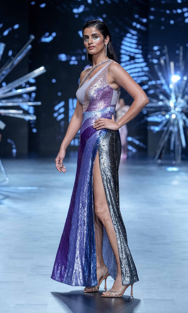"Sequin Sunset: Sapphiria's Brilliance" -The Sapphiria Gown is a masterpiece, a symphony of colors with sequin sheathing that shifts gracefully from twilight's deep ebony to the vivid blues, captivating purples, alluring pinks, and soft golden hues of sunrise. Each sequin, hand-embroidered, mimics the unique brilliance of natural gemstones. The sensuous straight cut, adorned with captivating cutouts from the shoulder to the cleavage, along with a sultry side slit, enhances the gown's allure, making it a captivating choice for any memorable appearance.