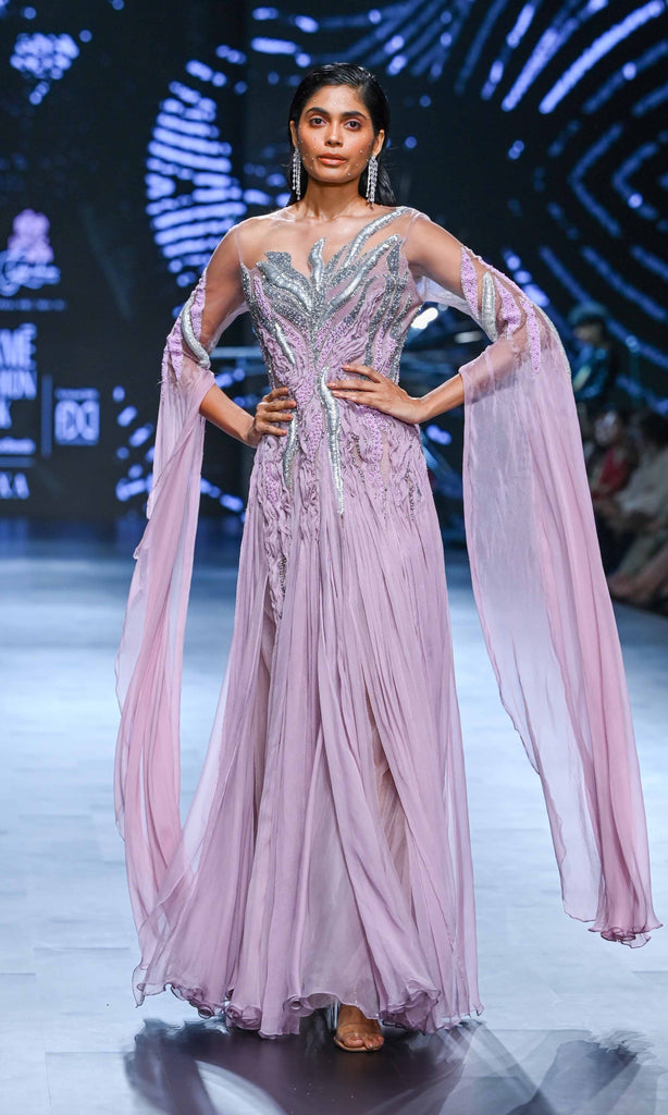 The Yveline Gown, draped in soft lilac chiffon, is a visual masterpiece. Its design is inspired by the crystallized shapes of stones, meticulously created with 3D metallic sheet art that appears to ascend dramatically. Enhanced by exquisite embellishments of pearls, sequins, and chiffon ruching, the gown boasts a breathtaking floor-length silhouette with elongated chiffon sleeves that flow elegantly, making it the epitome of refined sophistication. This gown is your perfect choice for a night of grace and grandeur.
