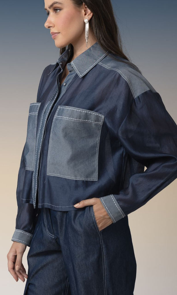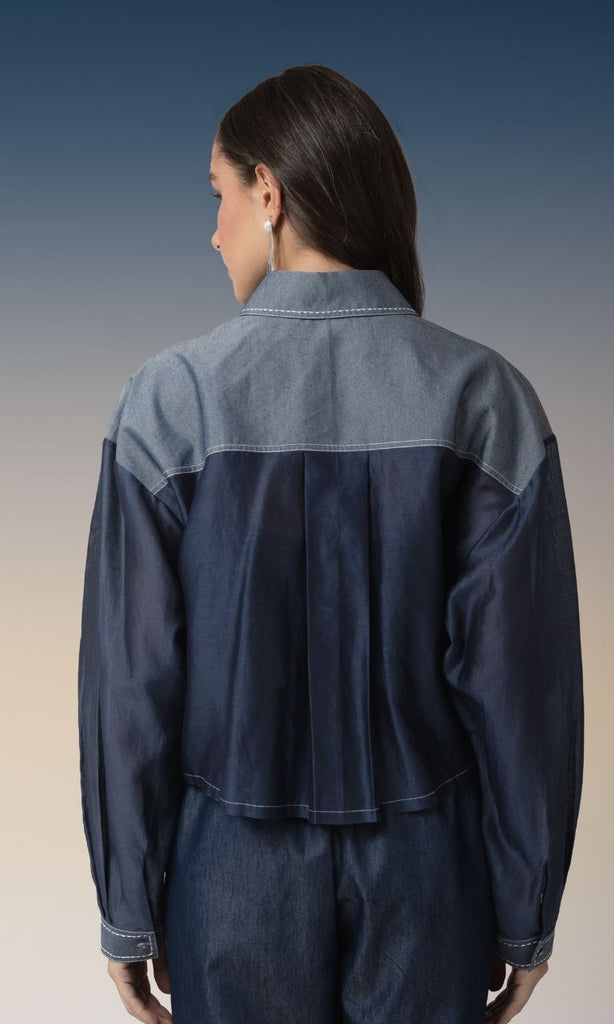 A stylish dual-tone denim shirt featuring contrast panels and oversized pockets. Relaxed, modern, and perfect for effortless everyday dressing.