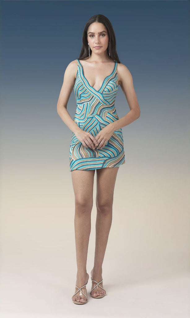 A sleek sleeveless mini dress featuring a mesmerizing wave-inspired pattern in refreshing aqua and sand tones. Designed with a flattering deep V-neckline and sculpting contour lines that enhance the silhouette, this body-hugging piece offers a modern, confident fit. Chic and statement-making, it’s perfect for cocktail nights, beachside parties, resort getaways, or evening outings where contemporary glamour takes center stage.