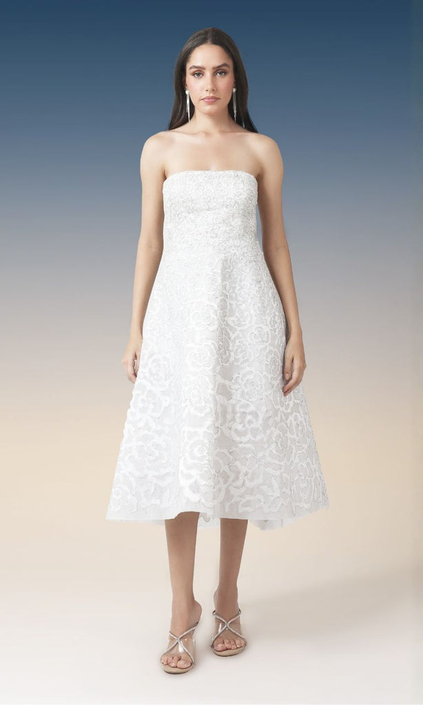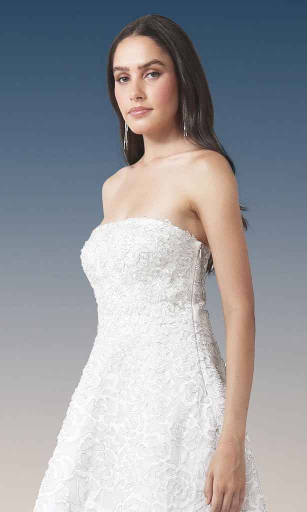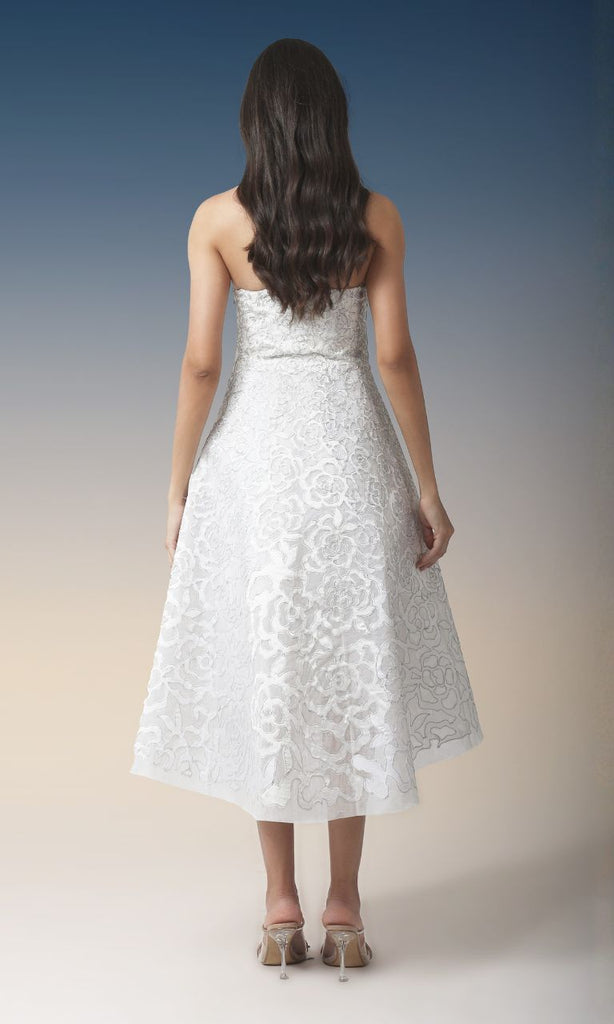 A graceful strapless bridal dress crafted in a soft ivory-white tone, featuring intricate floral lace patterns throughout. The fitted bodice flows into a beautifully flared A-line skirt, creating an elegant and romantic silhouette. Light, airy, and timeless, this dress is perfect for bridal occasions, receptions, engagement ceremonies, or elegant white-theme celebrations.