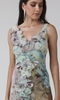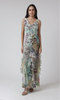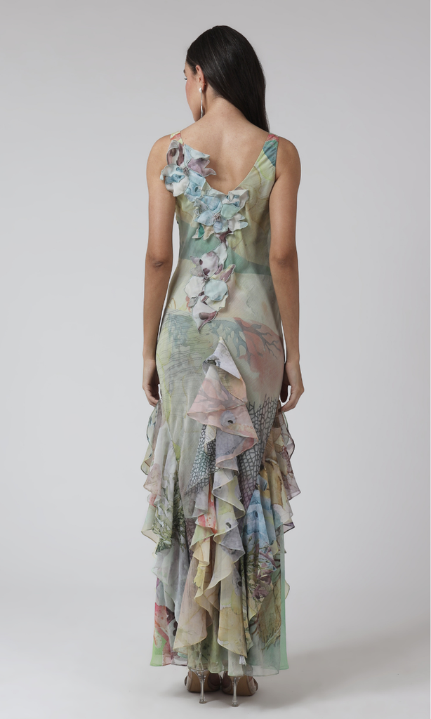 A breathtaking floor-length gown featuring a soft pastel floral print inspired by blooming gardens. Designed with a graceful sleeveless neckline and delicate 3D floral appliqué along the bodice, this dress flows into cascading layered ruffles that create elegant movement. Romantic and artistic, it’s perfect for destination weddings, receptions, cocktail soirées, or high-end evening celebrations where effortless elegance is desired.