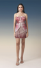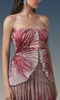 A striking strapless mini dress featuring sculpted pleated panels that create a dramatic wave-like effect across the bodice. Rendered in rich rose and blush tones, the sheer pleated skirt adds depth and elegance while keeping the silhouette sleek and modern. Ideal for cocktail nights, parties, and statement occasions.
