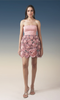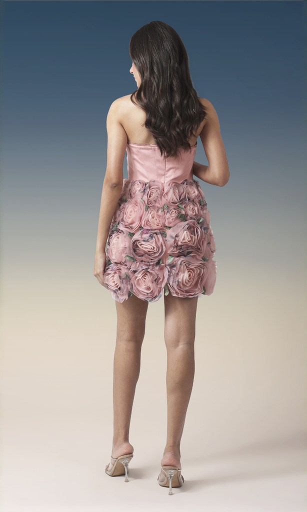 A charming strapless mini dress in soft blush pink, featuring a sleek fitted bodice and a statement 3D rosette floral skirt. Delicate textures and sculpted blooms create a romantic, couture-inspired look—perfect for cocktail parties, birthdays, or special evenings.