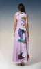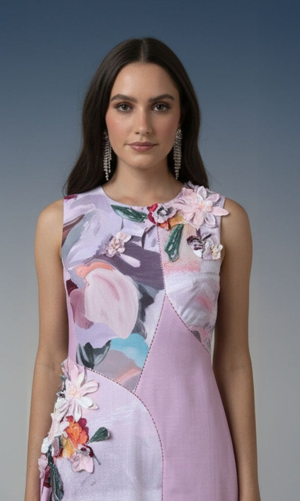 Embrace effortless elegance in this floor-length maxi dress, featuring a soft lilac base accented by bold, artistic floral motifs.The sleeveless, column-style silhouette provides a clean and modern look that elongates the frame beautifully.A unique ruffled side panel adds a touch of fluid movement and romantic flair to the structured design.The asymmetrical print placement ensures a dynamic visual appeal from every angle, making it a true standout piece.
