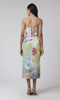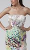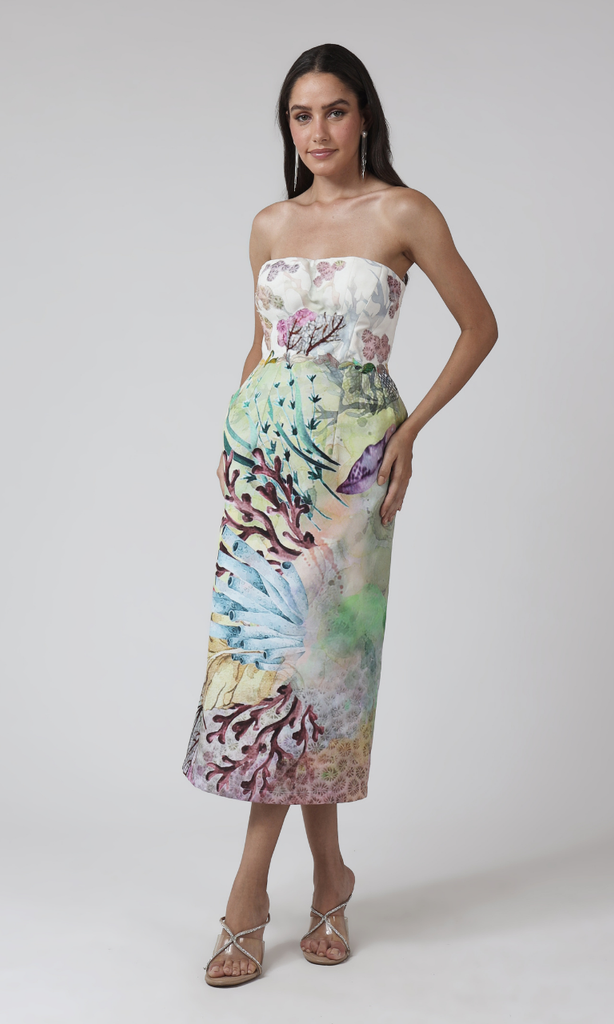 A graceful strapless midi dress featuring a soft pastel palette with artistic floral and botanical prints. Designed with a fitted bodice and a straight, elegant silhouette, it highlights a lace-up back for adjustable comfort and a refined finish. Perfect for summer gatherings, resort wear, or special daytime occasions, this dress blends delicate colors with a modern, feminine charm.