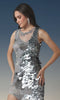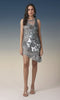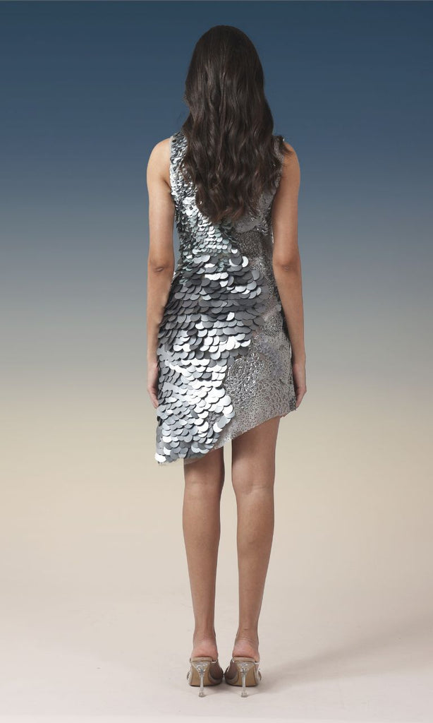 This striking silver mini dress features an asymmetric silhouette adorned with bold, cascading oversized sequins that create a dramatic, high-fashion statement. The base fabric showcases intricate textured embroidery, adding depth and dimension beneath the shimmering embellishments. A sheer illusion neckline softens the look while maintaining elegance. Perfect for cocktail nights, upscale parties, and occasions where you want a show-stopping, modern glam appearance.