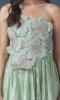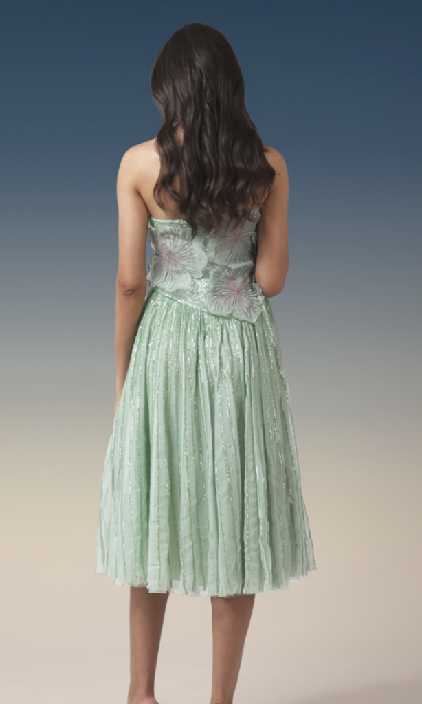 This elegant mint-green strapless midi dress features a beautifully crafted 3D floral bodice that adds a romantic and luxurious touch. The skirt flows gracefully with subtle shimmer detailing, creating a soft, ethereal glow with every movement. Perfect for parties, receptions, and evening occasions, this dress blends feminine charm with modern sophistication.