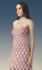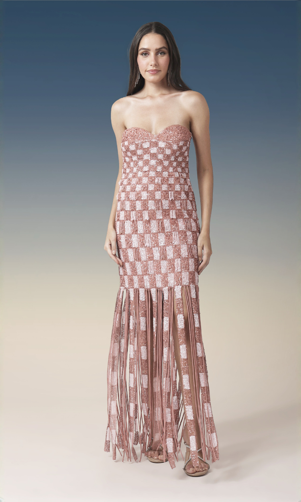 A glamorous strapless gown designed in shimmering rose gold tones with an elegant checkered sequin pattern throughout. The fitted silhouette enhances the figure, while the dramatic fringe hem adds fluid movement and a statement finish. Perfect for evening parties, cocktail events, and celebrations where bold elegance takes center stage.