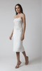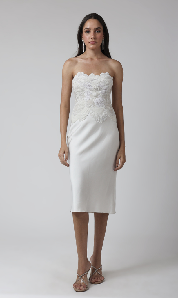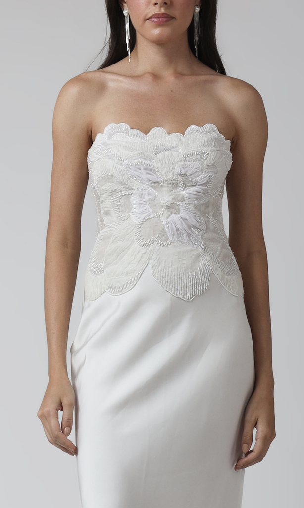 A timeless strapless gown in a pure ivory shade, designed with a beautifully fitted silhouette. The bodice features delicate floral lace appliqué that adds a soft romantic touch, while the smooth, streamlined skirt falls gracefully for an elegant finish. Perfect for bridal wear, receptions, or refined evening occasions, this gown blends classic sophistication with modern minimalism.