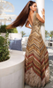 All your dreams of looking like a diva will come true with our 'Elisabeth' gown featuring delicate and intricate embroideries in a chevron pattern and a dramatic feathered bottom. Perfect for a reception party, style it with your delicate diamond jewelry and a tiny minaudiere bag for a regal look.