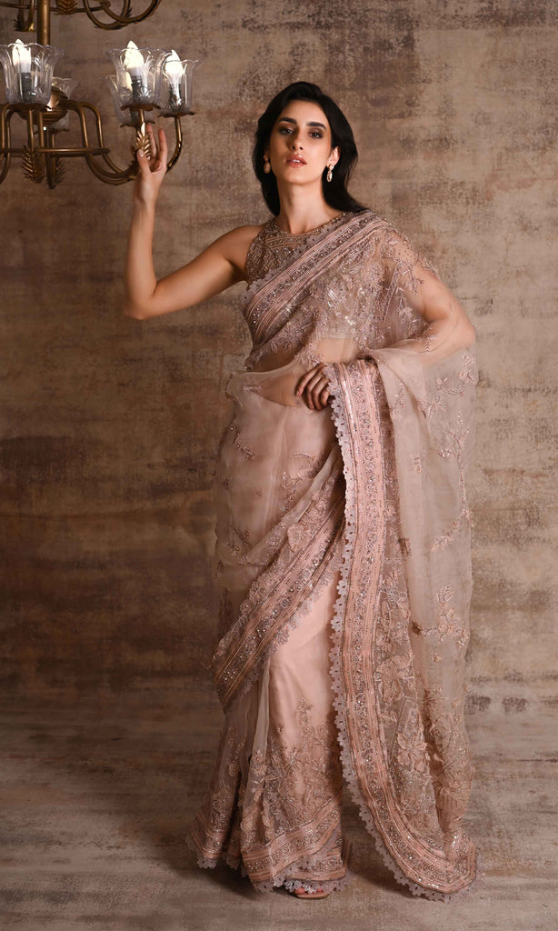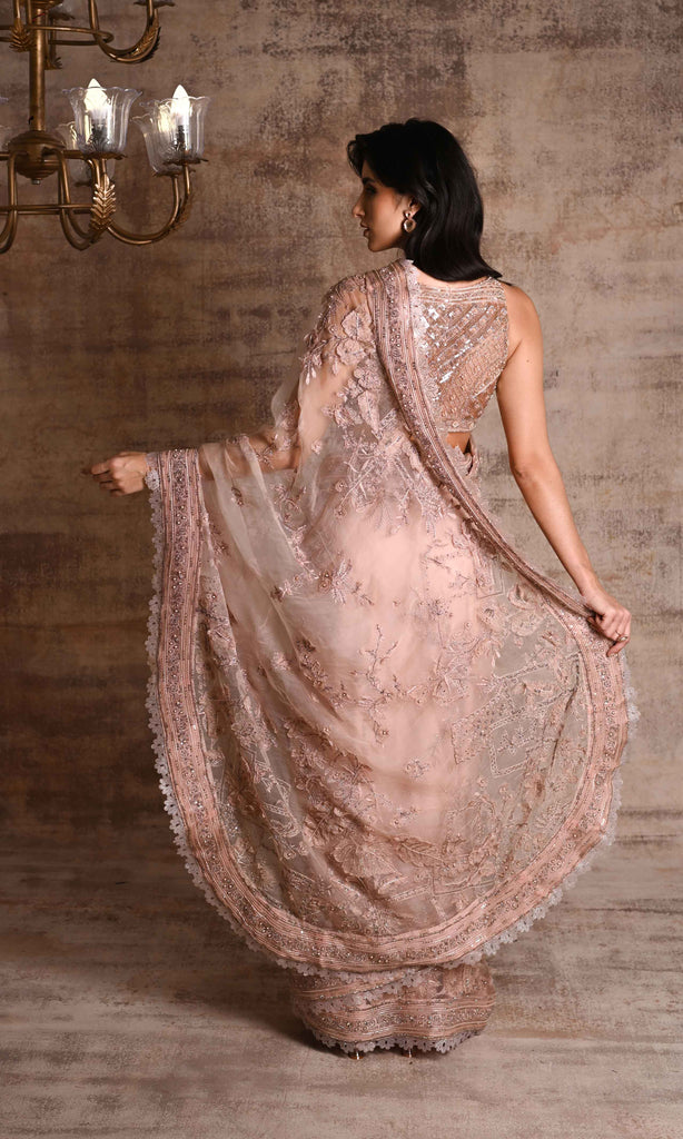 Wondering about the next breathtaking ensemble for your upcoming occasion? Look no further than the "Pink Karima Saree." This exquisite creation in organza is a masterpiece of embroidery techniques, featuring a laser-cut border detail that adds a modern twist to traditional elegance.  Complementing this ethereal saree is an intricately embroidered halter neck blouse, which is a work of art in itself. The floral motifs on the blouse harmonize with the saree's design, creating a cohesive and resplendent ensemble. The saree is heavily embroidered in tonal colors, evoking the captivating allure of a lush floral garden. It's the perfect choice to make a statement at your next special event.