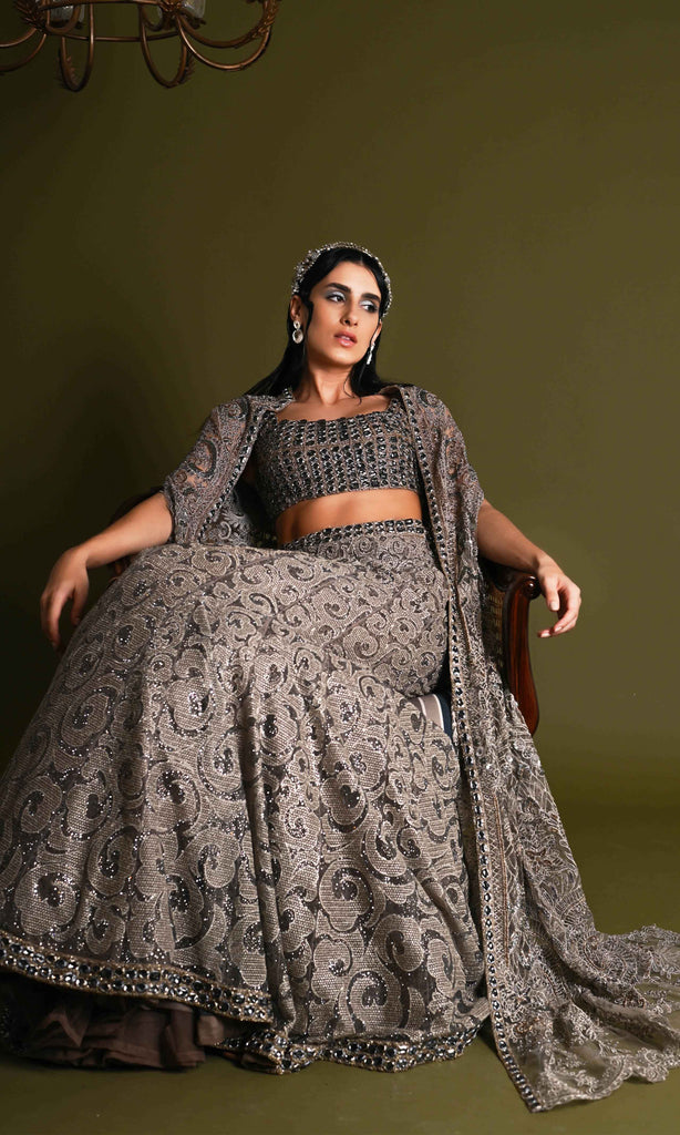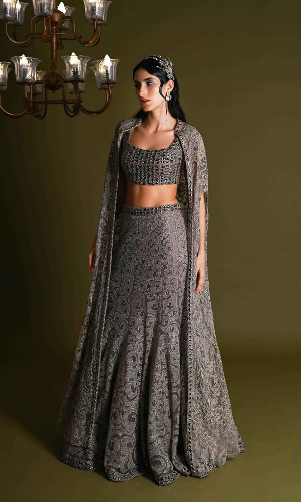 "Unveil the essence of the wedding season in our latest Kyra Crystal set, tailored to add elegance and charm to your reception and sangeet gatherings." Draped in silver splendor, the Kyra Lehenga Set is a captivating work of art, adorned with abstract floral-shaped embroideries and delicate crystals. Comprising a lehenga with intricate motifs and crystal-studded waistband, paired with a crystal-studded blouse and a richly embroidered cape, it's the epitome of sophistication. Ideal for making a grand entrance at your special occasion.