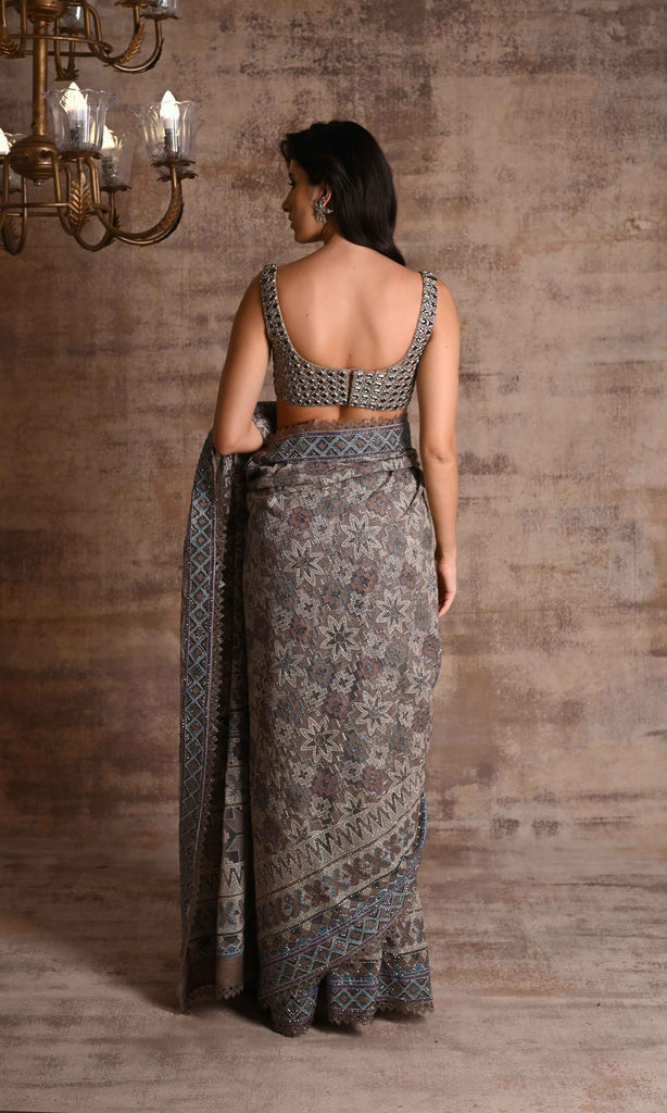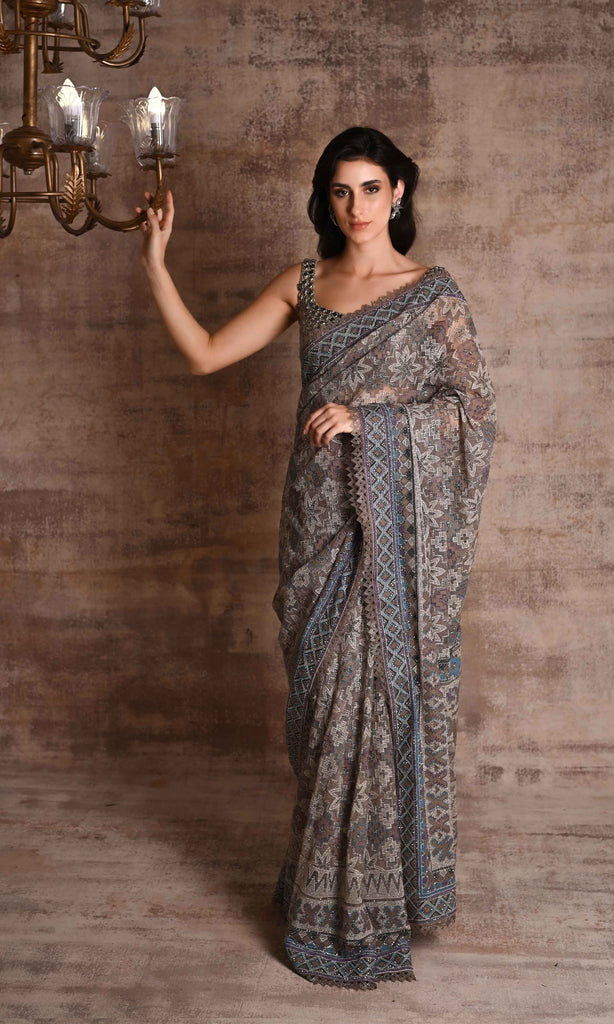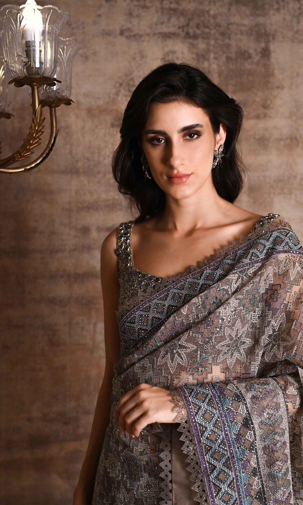 "Be the center of attention at the next soirée with our meticulously crafted LYA saree, a fashion-forward statement for your special gatherings." The Lya Saree is a radiant masterpiece adorned with abstract geometric embroideries in shades of blues, purples, and metallic silver. This intricate embroidery graces the entire saree, creating a captivating canvas of artistry. Perfect for your post-wedding celebrations, the Lya Saree exudes sophistication and style.