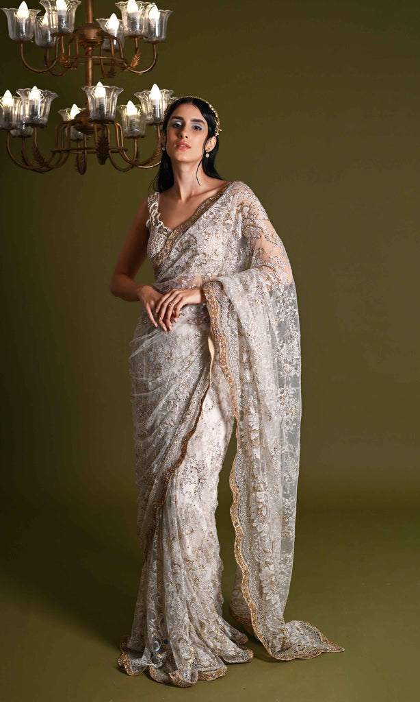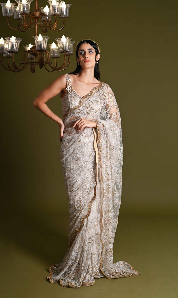 Discover the Marisela Saree – an exquisite choice for your reception attire. "Radiant in White: The Marisela Saree with Cape" is a canvas of pure white lace adorned with sparkling crystals, radiating an ethereal elegance. The gold-embroidered crystal border frames the saree beautifully. What makes it unique is the sheer gold-embroidered cape that drapes over the saree, glistening with intricate embroidery. Whether it's a grand soirée, wedding reception, or special event, this ensemble ensures timeless charm and beauty.