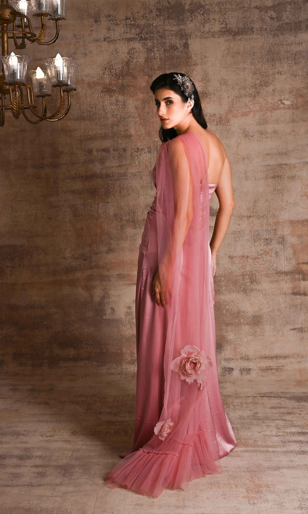 The waist adorned with shimmering silver crystals makes this gown a sparkling sensation, turning every head in the room. The pièce de résistance, a tulle pallu cascades gracefully at the back, adorned with delicate floral patches. The Delnaz Gown is more than an outfit; it's an embodiment of your unique style and timeless beauty.