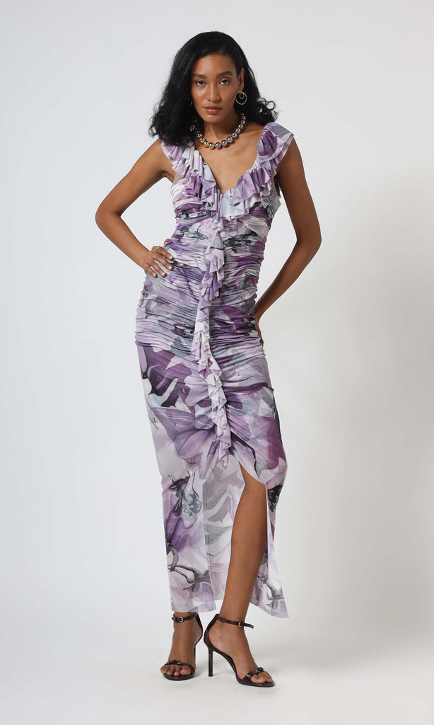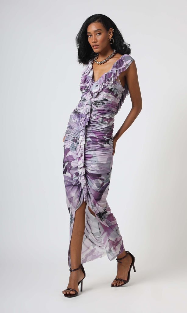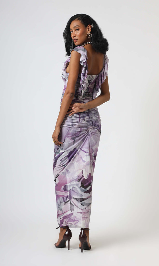 This stunning dress is a true work of abstract art, blending soft purples and greys in an elegant delicate ruffle detailing. Perfect for a sophisticated evening or an art gallery opening, this dress combines elegance with an avant-garde flair. Pair it with sleek heels and statement jewelry to make every moment feel like a masterpiece.