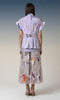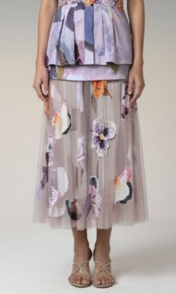 This unique layered midi skirt features a structured lilac mini-skirt upper and a dramatic, sheer tulle lower half. The base layer is detailed with bold, abstract botanical shapes in earthy greens and warm tones. The standout feature is the transparent tulle overlay, which is adorned with scattered, vibrant floral and leaf-like patches that create a 3D artistic effect. Designed with a high-waisted fit, this skirt offers a playful mix of textures and transparency, making it a perfect statement piece for high-fashion occasions.