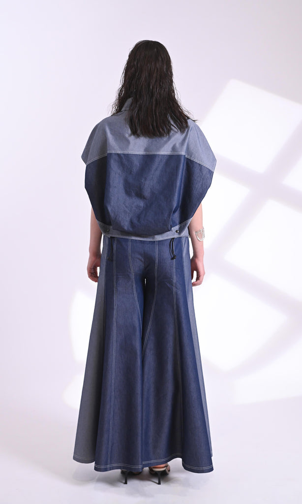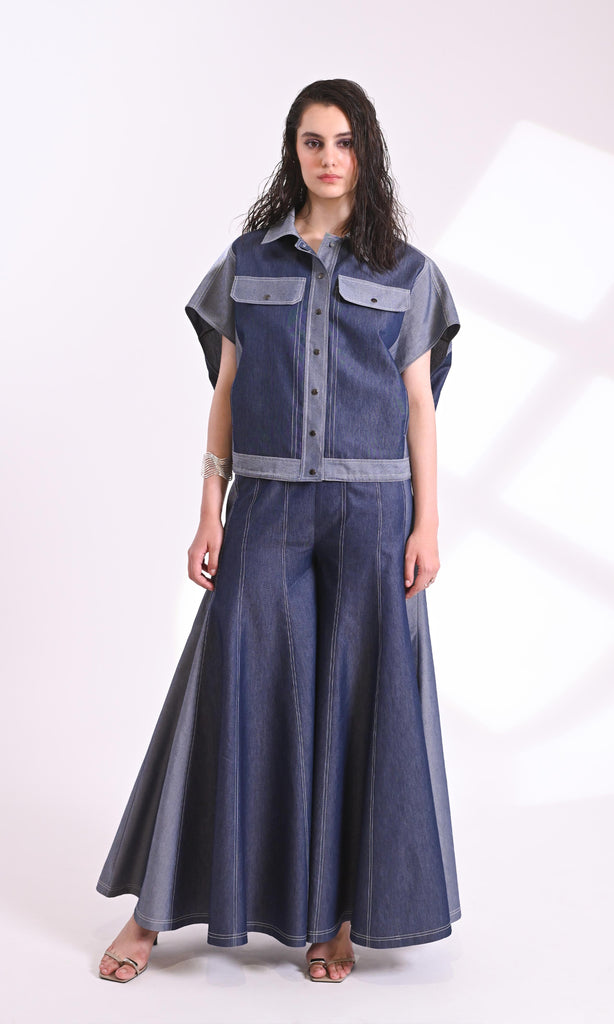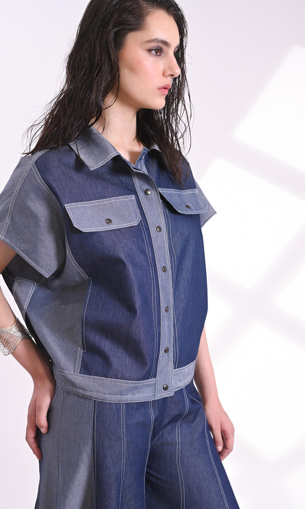 A modern twist on classic denim, this cropped shirt features a patchwork design with mixed washes, cap sleeves, and front flap pockets. Effortlessly cool, it’s perfect for layering or making a bold statement on its own. Pair it with high-waisted jeans for a head-to-toe denim look or style it with a sleek skirt for a fresh contrast.
