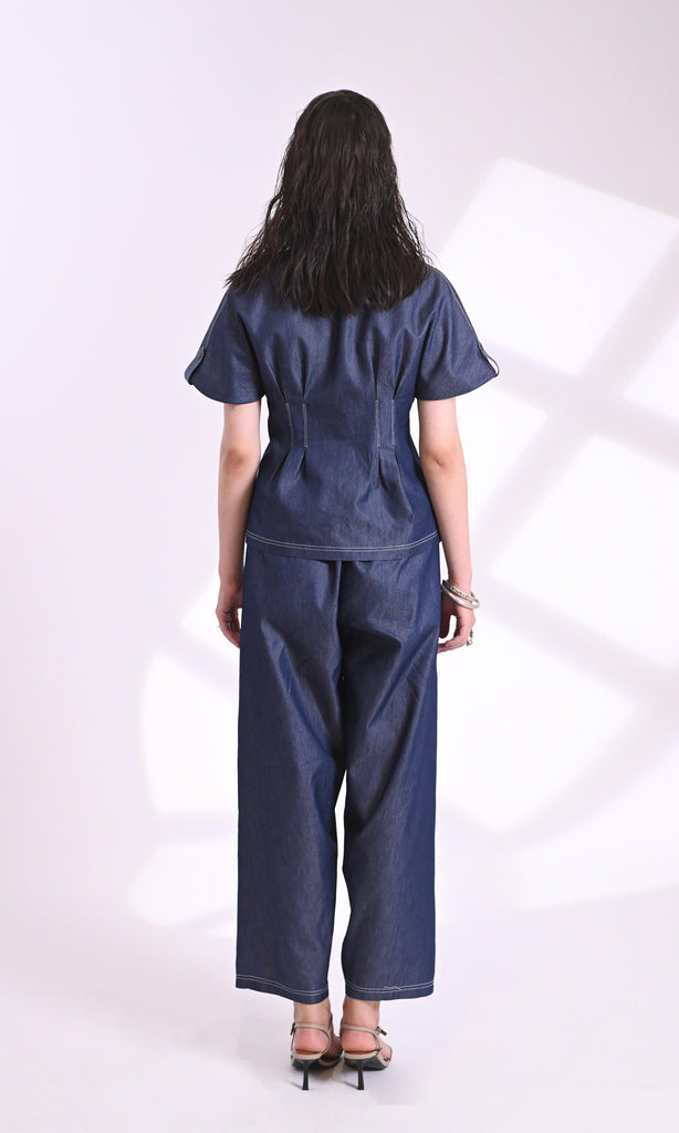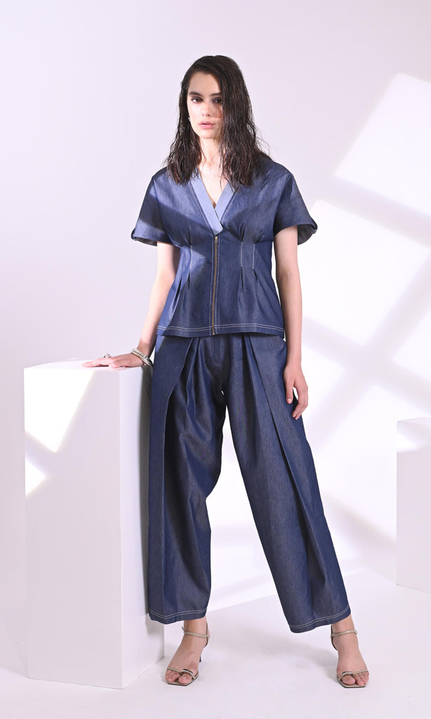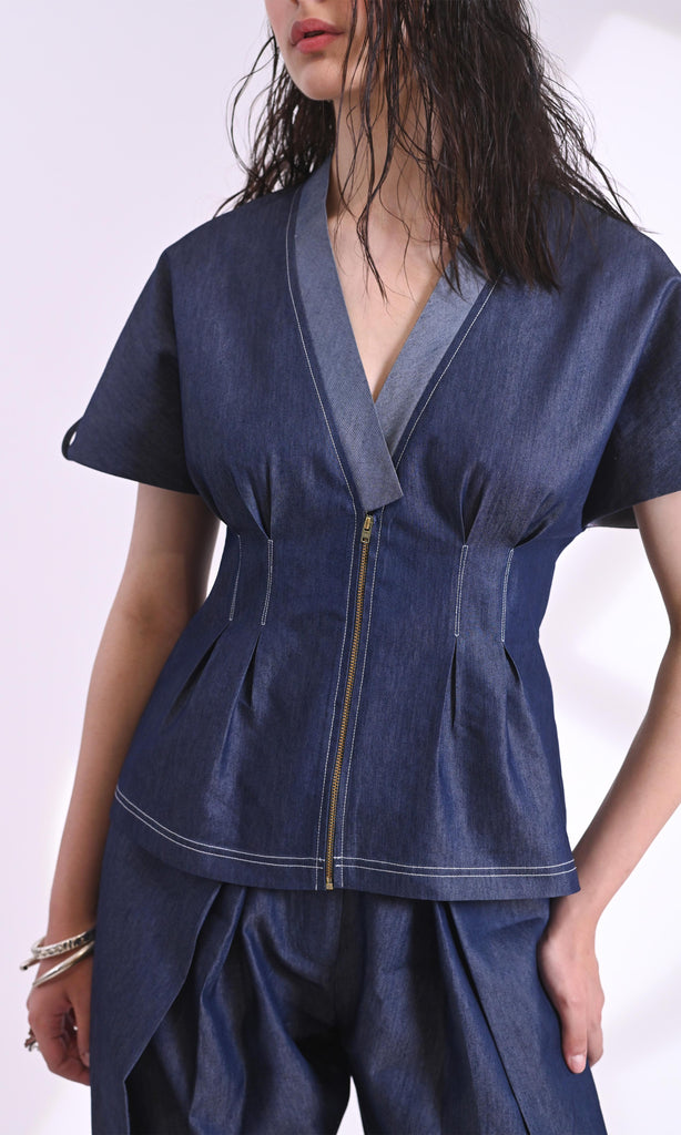 A chic fusion of structure and ease, this denim top features a deep V-neck, zip-front closure, and a cinched waist for a flattering silhouette. The short, flared sleeves add a touch of softness, making it perfect for effortless day-to-night styling. Pair it with jeans for a sleek denim-on-denim look or style it with tailored pants for a modern twist.
