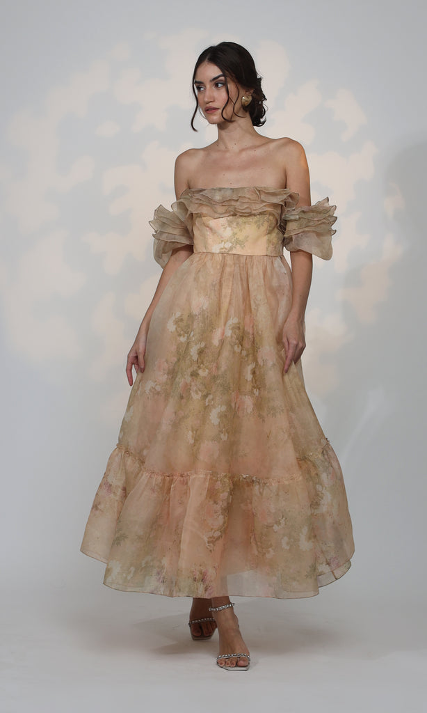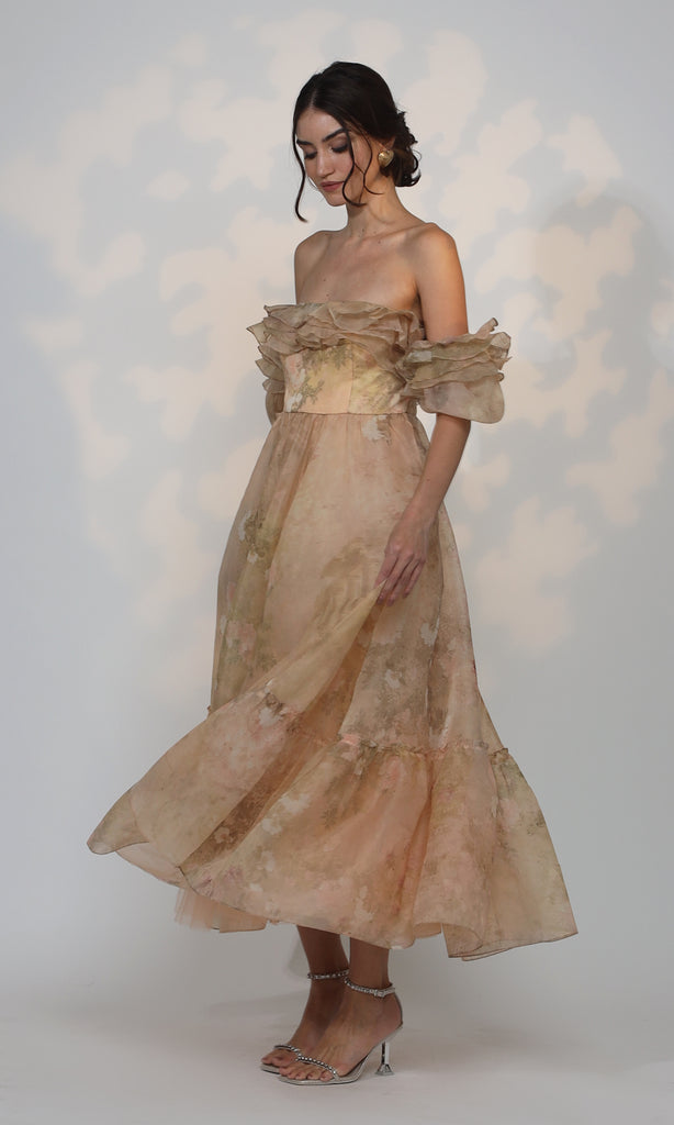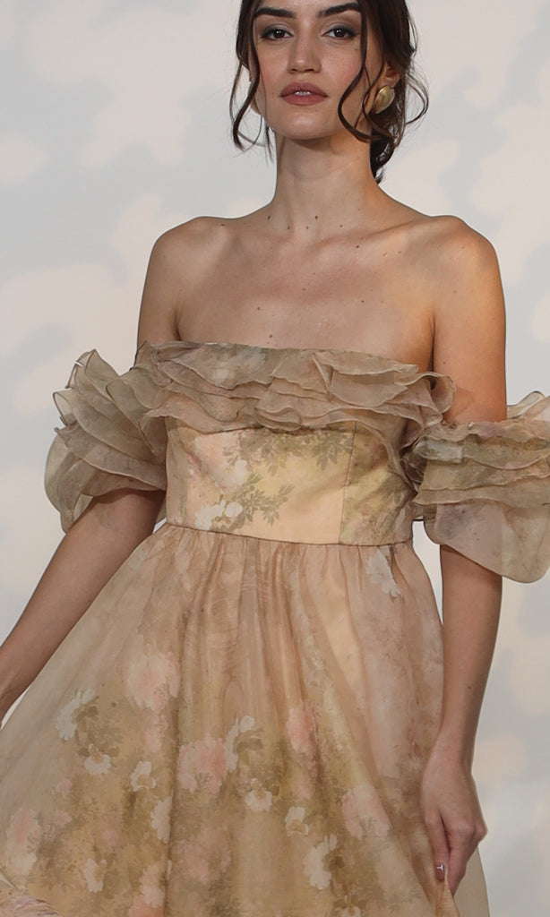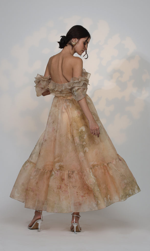 "Indulge in the romance of nature's blooms with our handpicked Linnet Dress." The Linnet Dress is a captivating creation made from printed organza, adorned with a delicate off-white floral garden. Inspired by vintage florals, this garment effortlessly transports you to the bygone era of Jane Austen's timeless elegance. Slip into the Linnet Dress and relive the charm and grace of the past while radiating a sense of vintage sophistication.