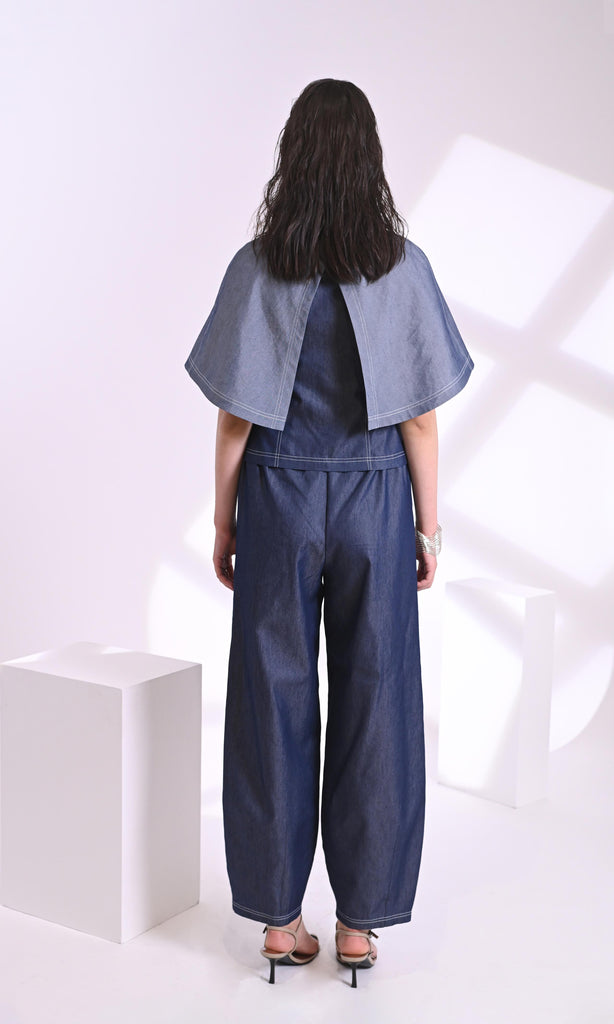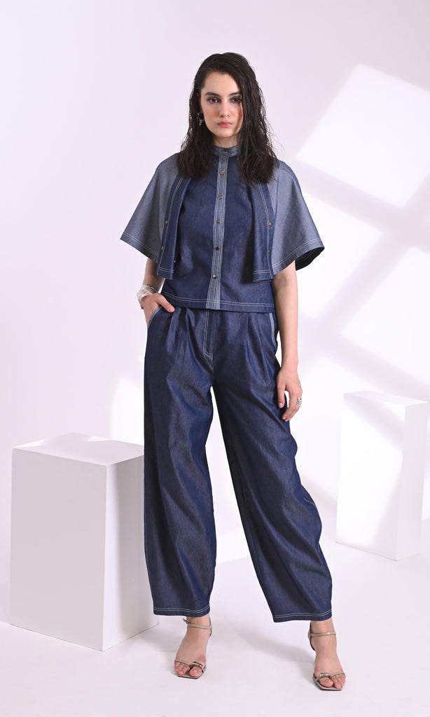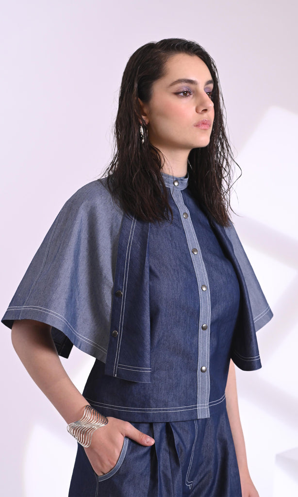 Elevate your denim game with this statement cape-sleeve jacket. Designed with a mix of light and dark washes, it features a structured fit, front zipper closure, and flowy, oversized sleeves for a bold yet refined look. Perfect for layering over fitted tops or dresses for an effortlessly chic edge.