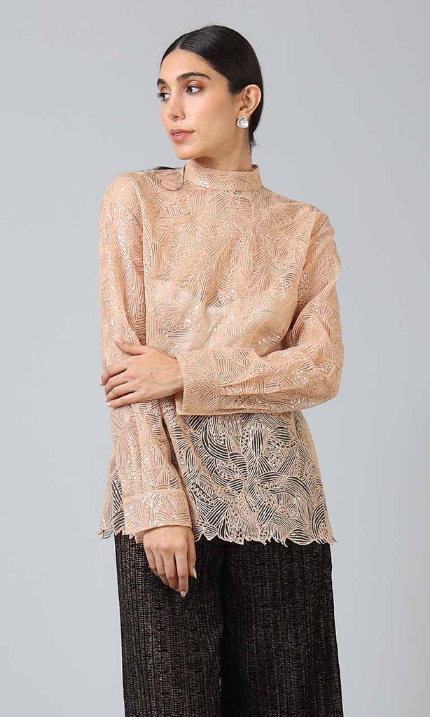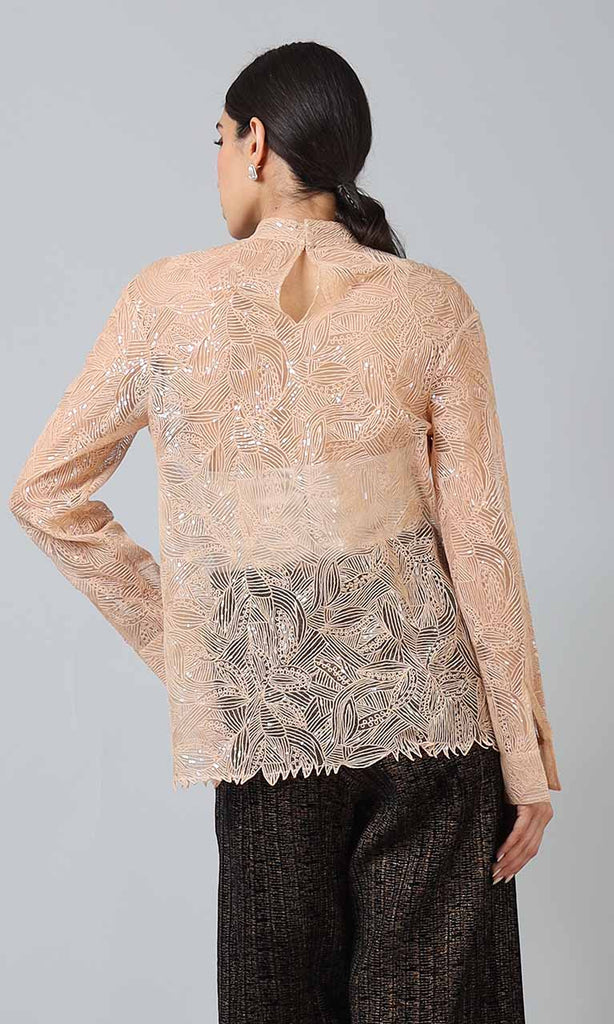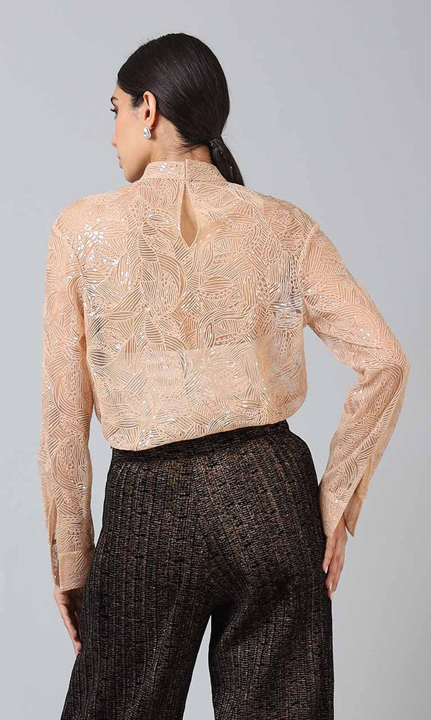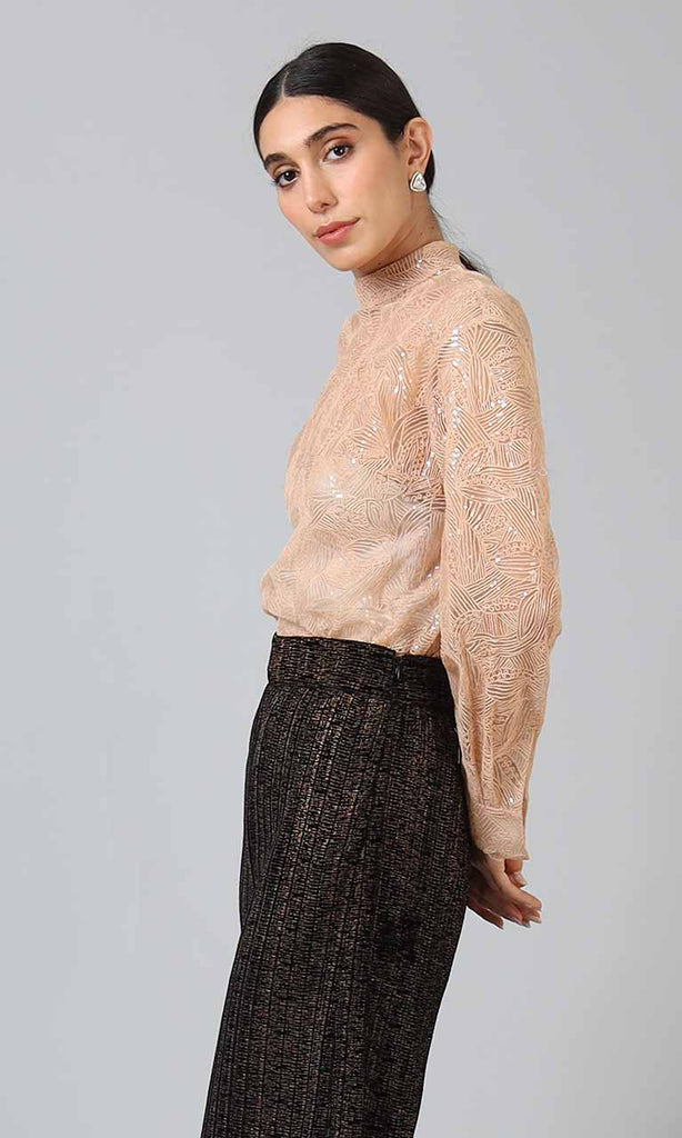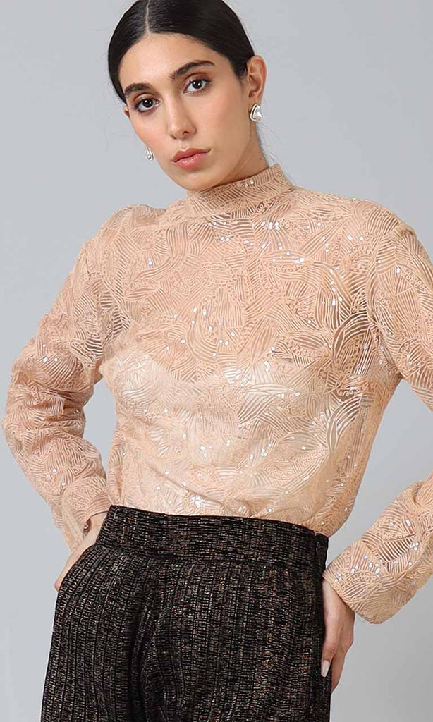 This sequin top in beige color can be styled with flared trousers to get a chic look. Pair it with big dangle earrings and a black clutch.