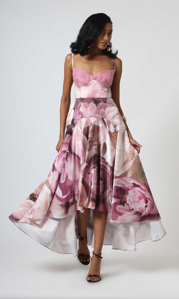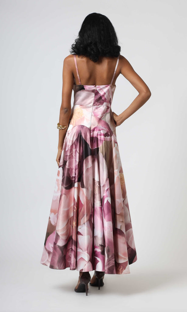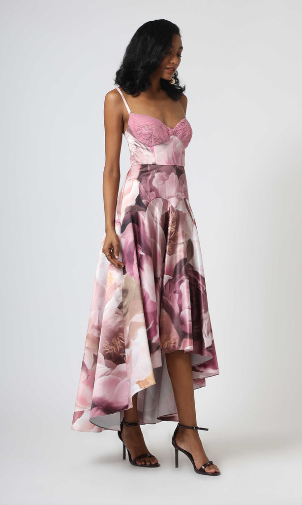 The 'Peony Haze Dress' is a match made in peony heaven for the lady who blossoms everywhere she goes, This dress features a delicate sweetheart bodice with slim spaghetti straps, flowing into a captivating high-low hemline adorned with vibrant peony prints in soft pink hues. Ideal for summer weddings or garden parties, this dress moves gracefully with every step.