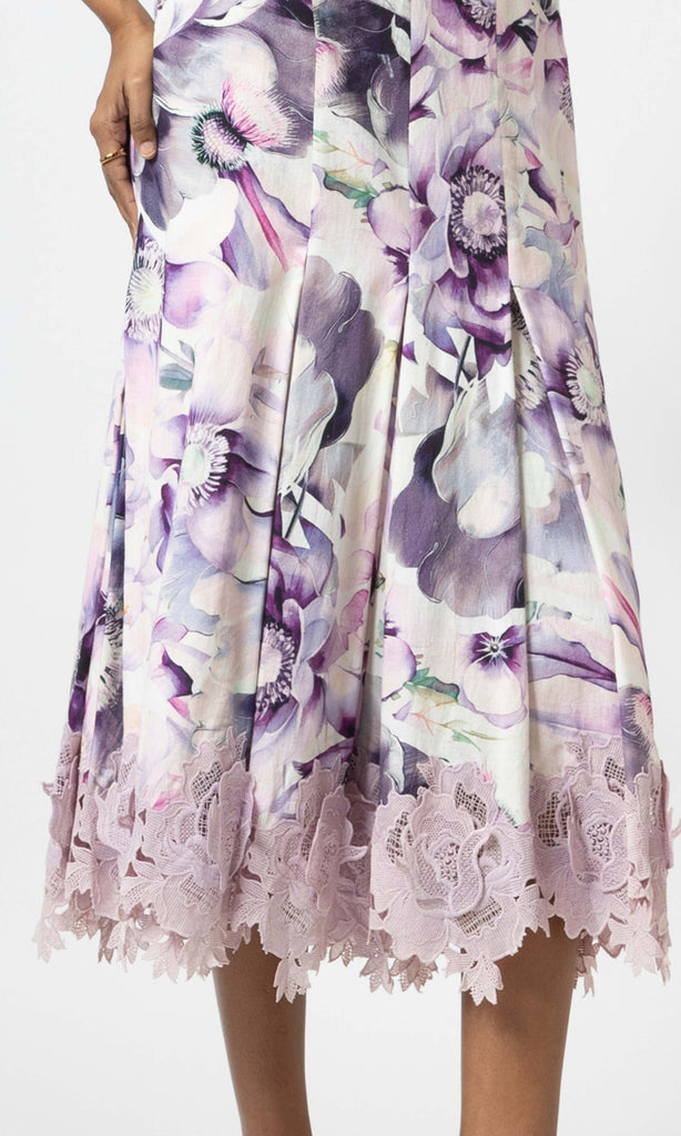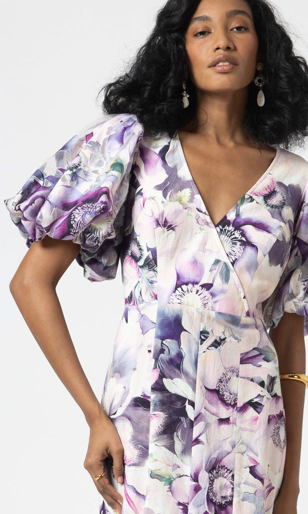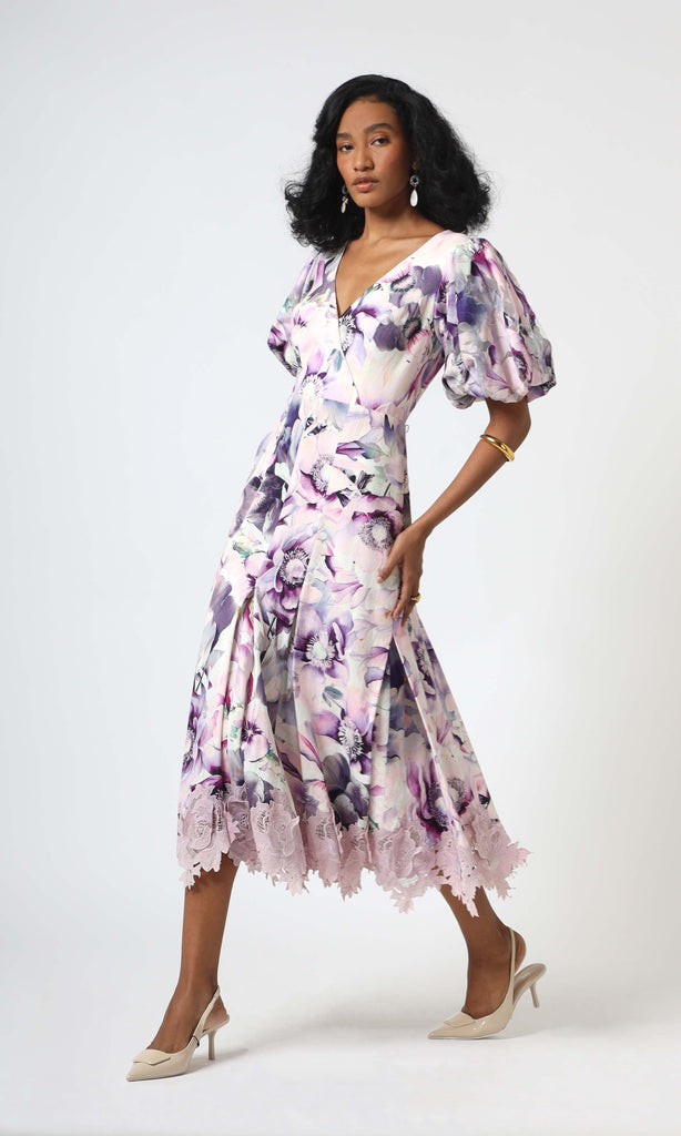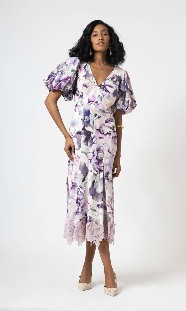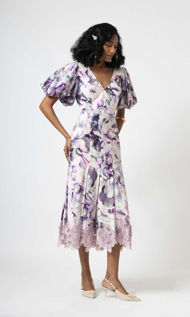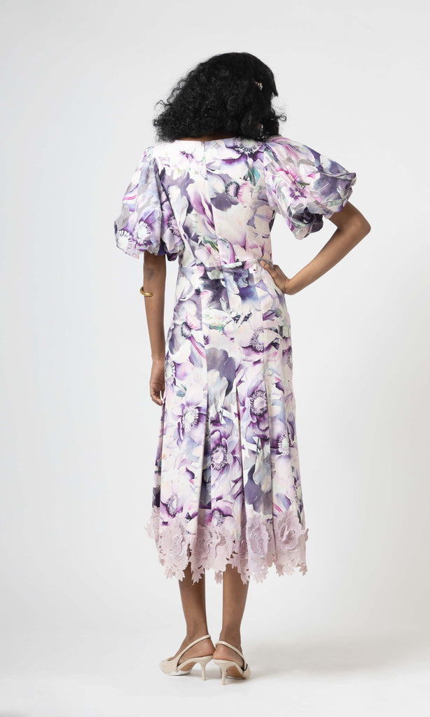 For the playful dreamer who loves to weave stories through her style, this floral lavender dress is the perfect companion. With whimsical puff sleeves and a romantic lace hem, it blends elegance with a touch of playful charm. Pair our 'Ryla midi dress' with statement earrings and playful heels, and let the world become the backdrop to your own magical tale.