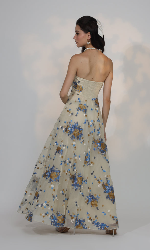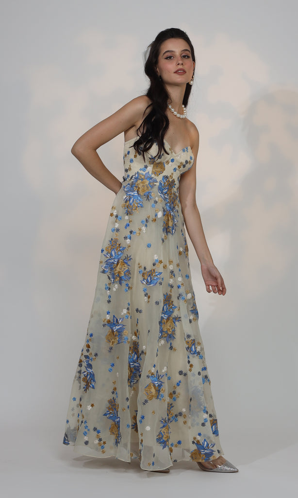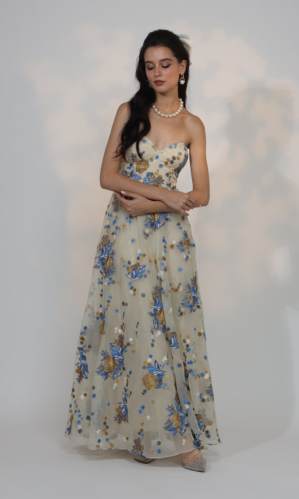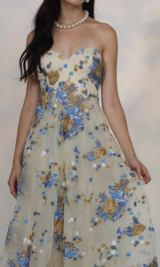 "Escape to paradise in style with our Zinnia embroidered dress, where comfort meets luxury." Adorned with charming yellow and blue florals, as well as ditsy flowers, this dress captures the essence of natural beauty. Its flattering design combines a chic corset-style top seamlessly attached to a full, flared skirt, ensuring you exude elegance with every step. Embrace the allure of the Zinnia Embroidered Dress and make a statement in floral fashion.