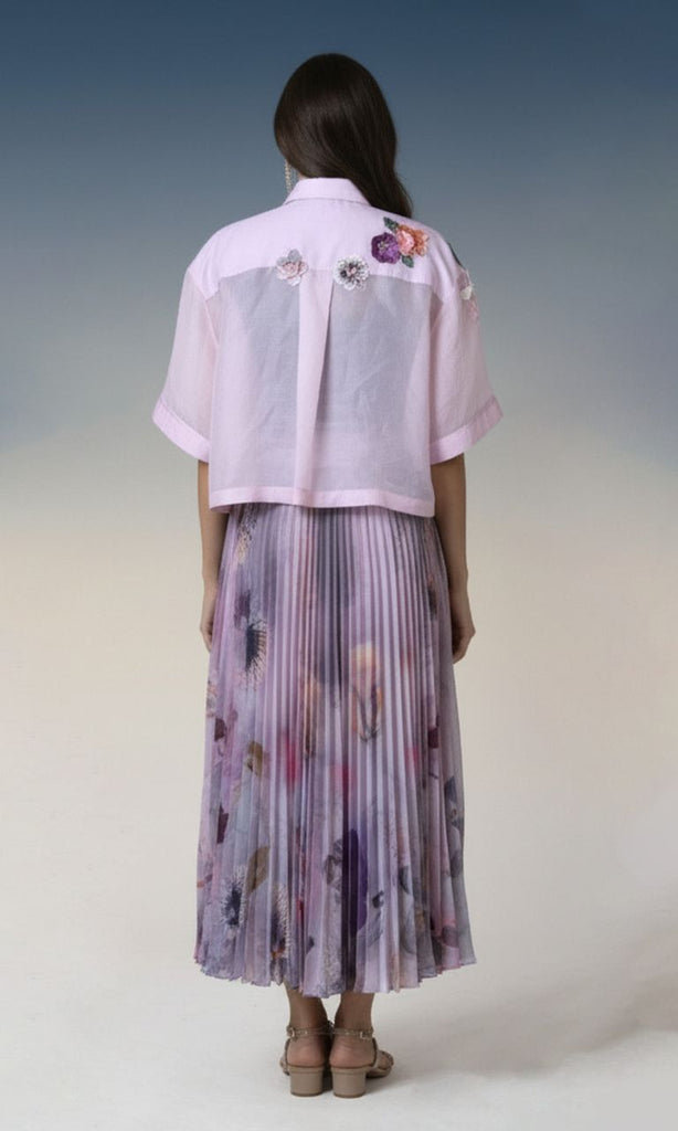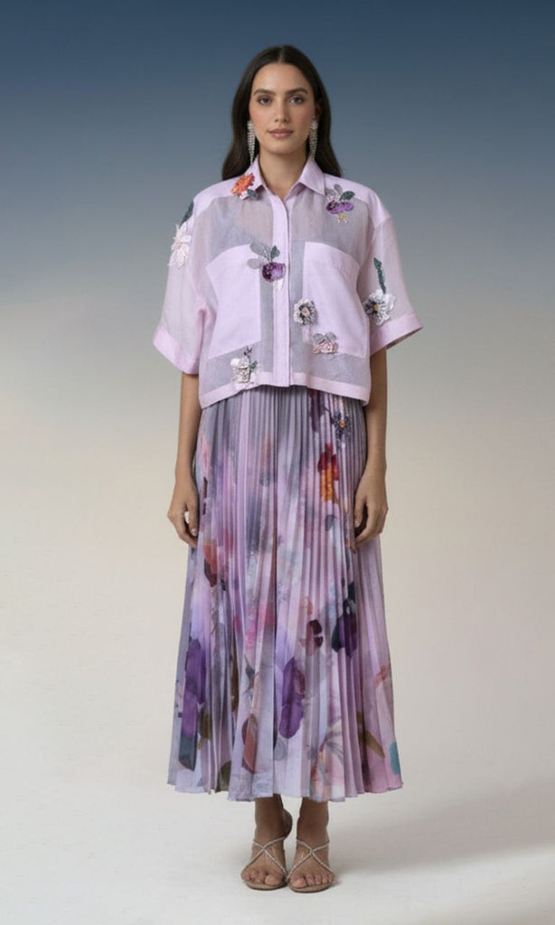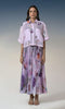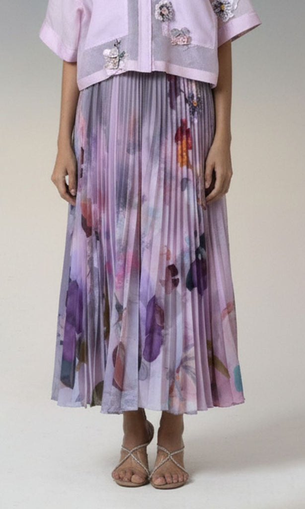 This long, pleated skirt features a graceful, fluid silhouette with a soft lilac and pink watercolor base. The design is enriched with an all-over artistic print, showcasing abstract botanical shapes and vibrant splashes of purple, orange, and teal. Constructed with delicate vertical pleats that add texture and movement, the skirt sits comfortably at the waist with a clean waistband. It is a versatile, statement-making piece that pairs beautifully with a simple blouse or its coordinating printed top for a full ensemble.