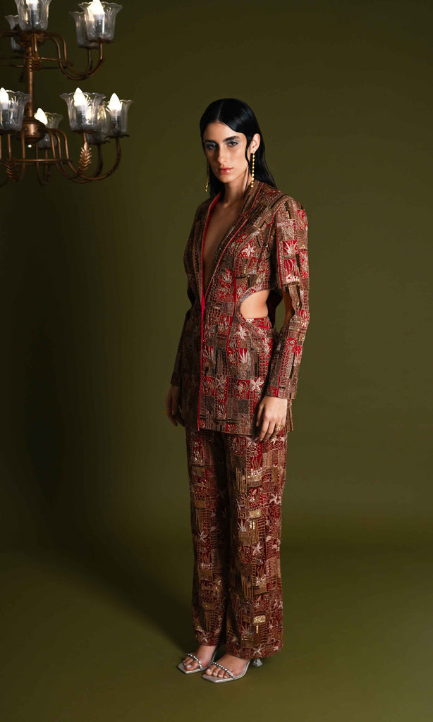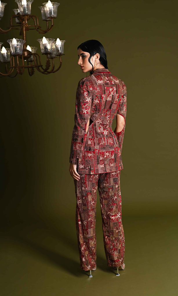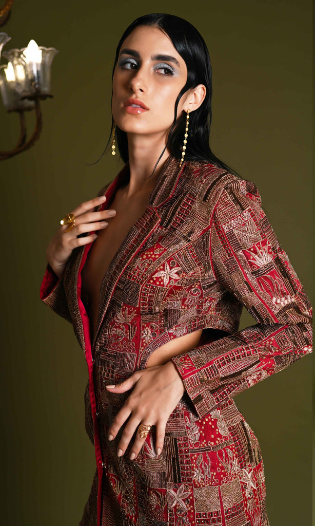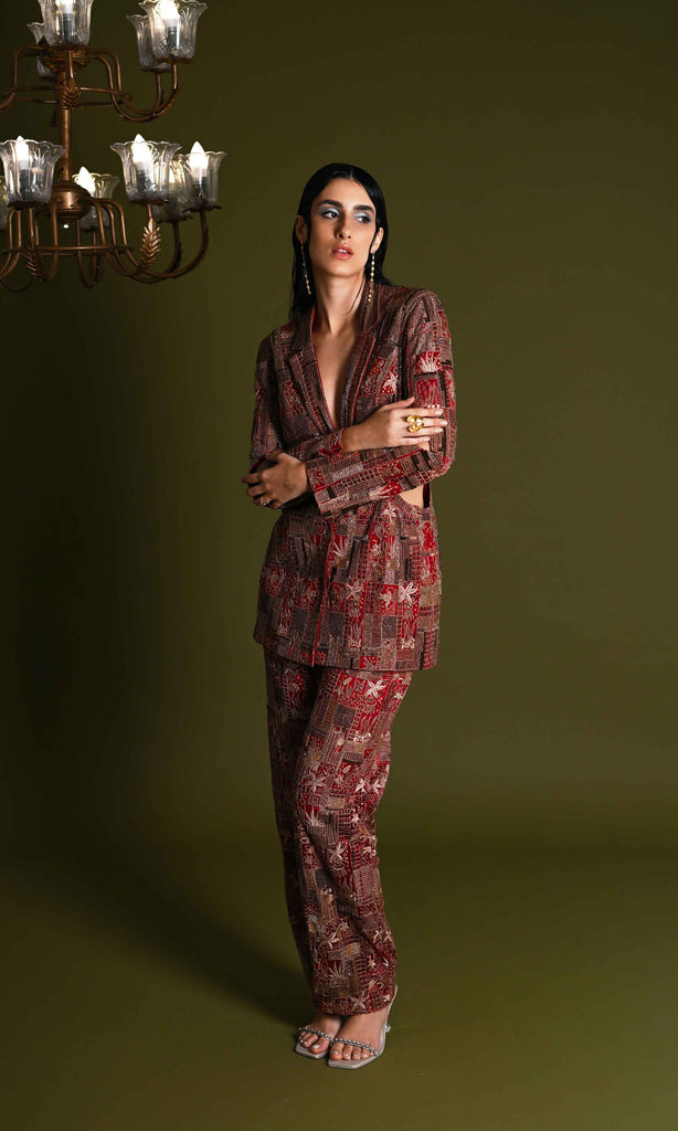 Tired of the Same Old Styles? Introducing Azraa Pant Suit in Red Abstract Embroidered Elegance. If you're weary of conventional fashion, the Azraa Pant Suit is your breath of fresh air. This ensemble is a stunning work of art, featuring an overall abstract embroidery on both the blazer and pants, in a scarlet red hue. Azraa Pant Suit is the ideal choice for a confident and refreshing reception look. Its rich embroideries add depth and character to your attire, making it perfect for any modern day special event where you want to make a statement.