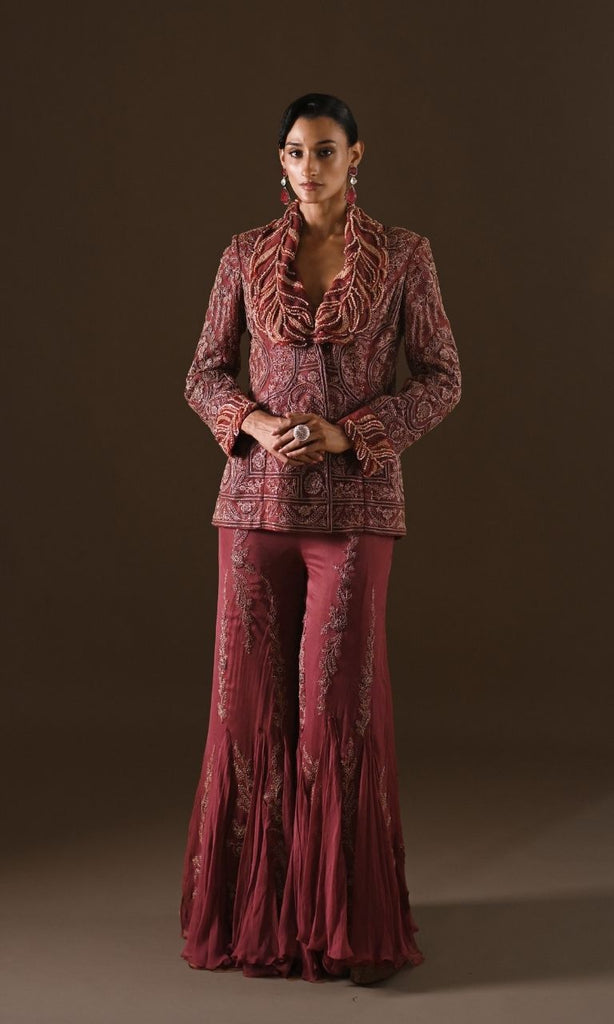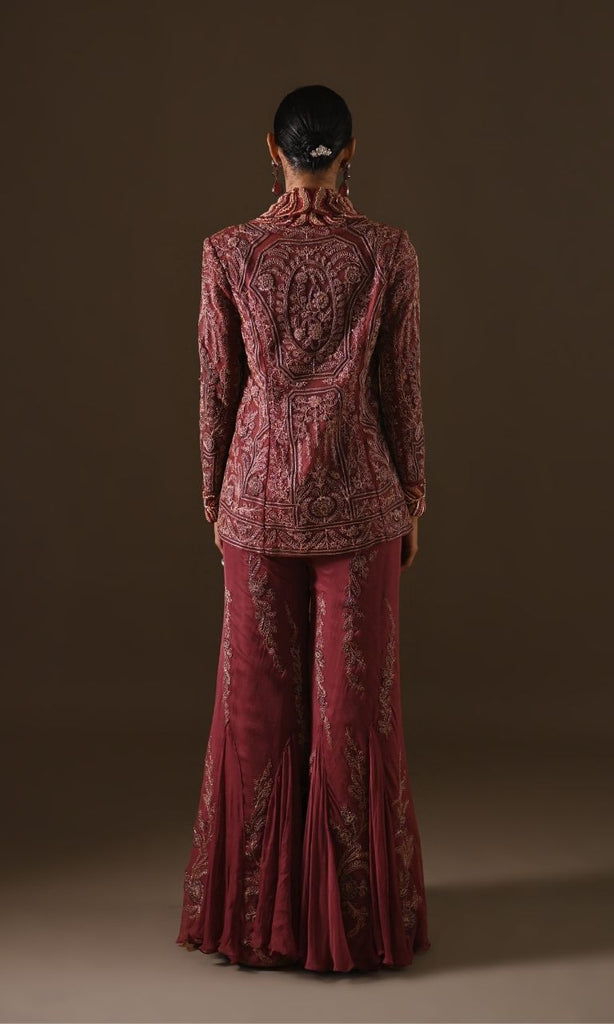 A striking fusion of power dressing and couture craftsmanship, this maroon embroidered suit set redefines occasion wear with bold elegance. The tailored jacket is richly embellished with intricate threadwork and bead detailing, creating a tapestry-like surface that exudes artisanal luxury. Paired with fluid, panelled flared pants that add graceful movement, the ensemble beautifully balances structure and softness. Perfect for cocktail evenings, festive celebrations, and statement moments — this set is designed for the woman who owns her presence with effortless confidence.