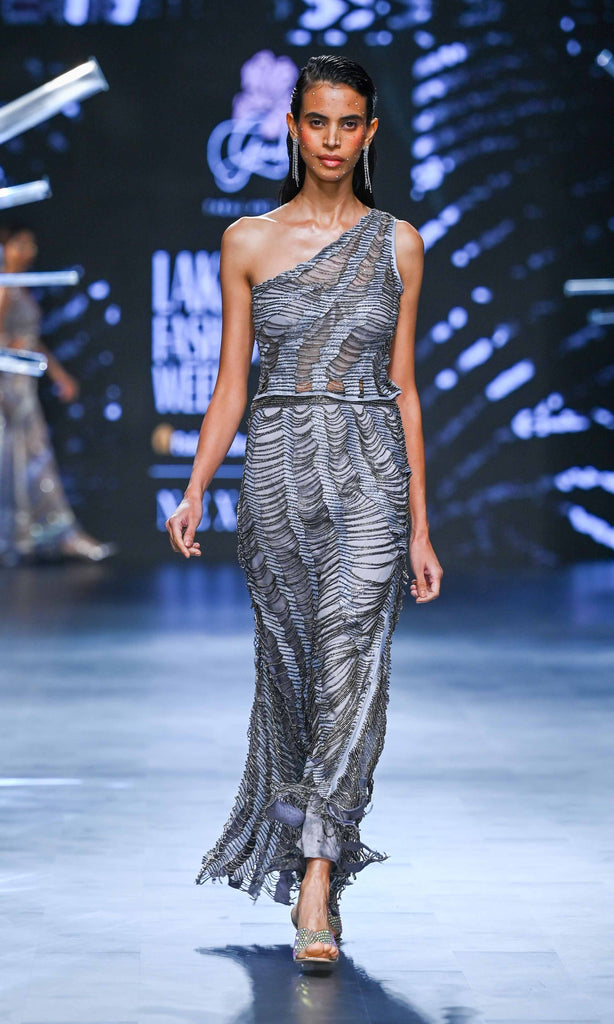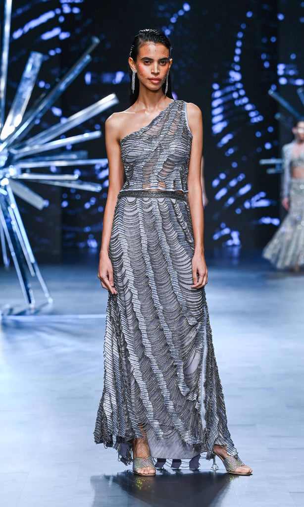 Introducing the Lira Skirt Set, a cutting-edge fashion innovation. Crafted with modern laser-cutting techniques, the fabric unveils an abstract, body-complementing pattern, accentuated with gunmetal beadwork. The ensemble pairs an asymmetrical one-shoulder top with a skirt featuring intricate Jall detailing, all in a sleek, glossy grey shade. The loose beading adds captivating allure, making this outfit a symbol of contemporary chic and sophisticated modernity.