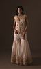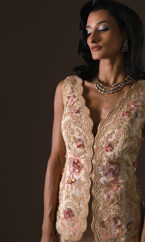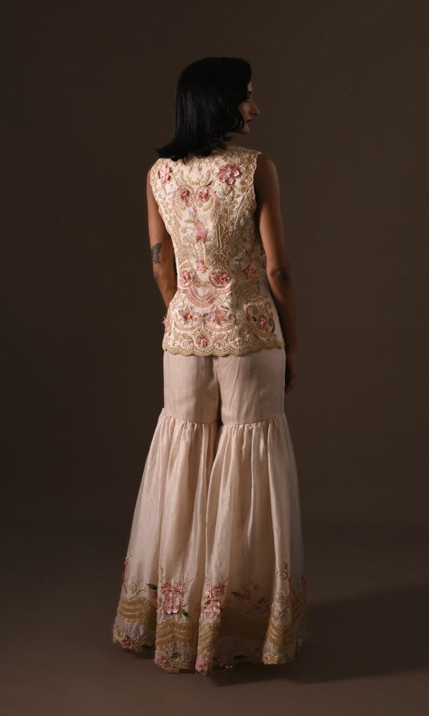 An ode to delicate craftsmanship, this ivory and blush embroidered sharara set blends vintage charm with contemporary elegance. The sleeveless jacket features intricate thread work, scalloped edges, and soft 3D floral detailing that adds depth and refinement to the silhouette. Paired with fluid, tiered Sharara pants adorned with matching embroidery along the hem, the ensemble moves gracefully with every step. Perfect for intimate celebrations, festive occasions, and daytime weddings — this look captures the beauty of heritage artistry with a modern, feminine touch.