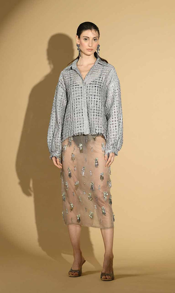 The Mila set features a sheer embroidered with metallic tassels and an oversized mesh shirt. A chic style guaranteed to make a statement at any soiree. Style it with statement jewelry and high heel pumps for an elegant look.