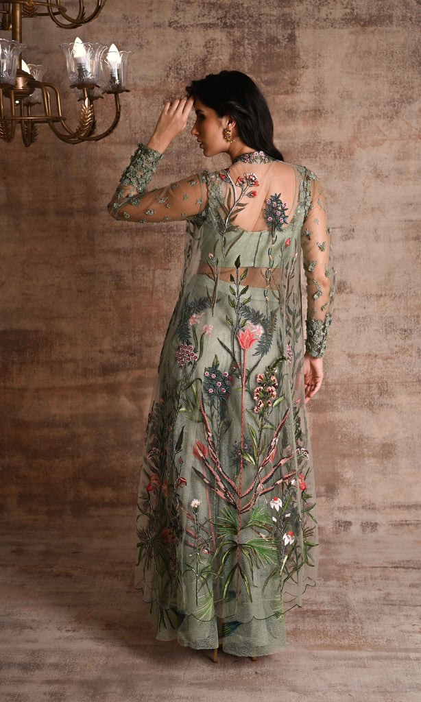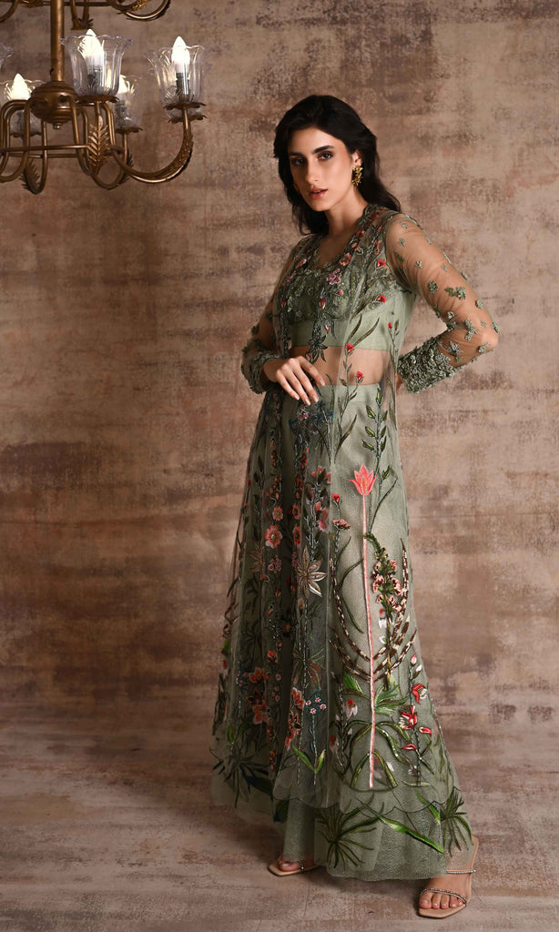 Announcing our stunning Nassira green sharara set, designed to make your presence unforgettable at the mehendi and sangeet celebrations." The Yassira Green Sharara Set is an enchanting masterpiece, meticulously embroidered with rich whimsical florals. This ensemble encompasses three key pieces: a graceful top, an alluring sharara, and a mesmerizing overlay jacket adorned with vibrant floral motifs. Elevate your style and radiate sophistication at your special moments with our captivating creation.