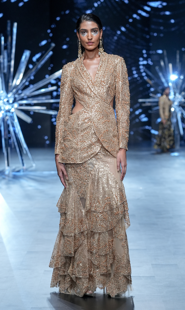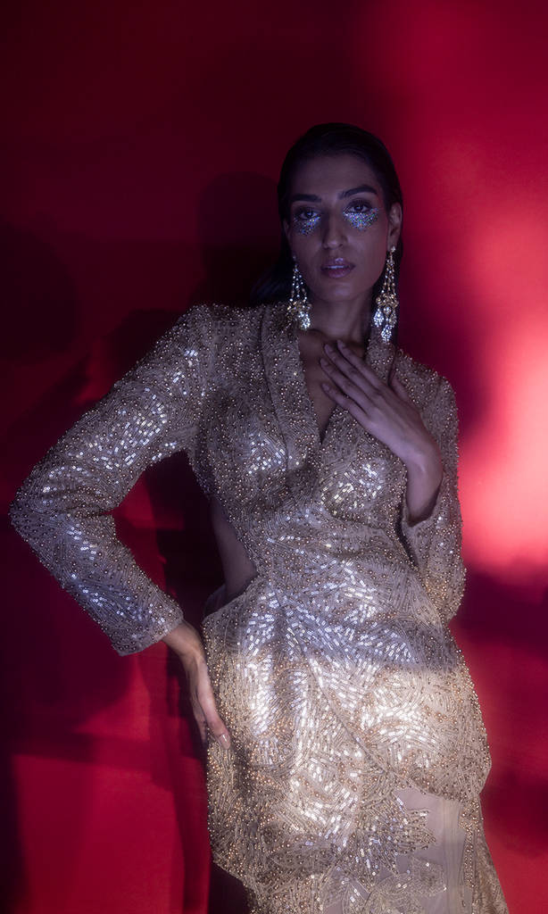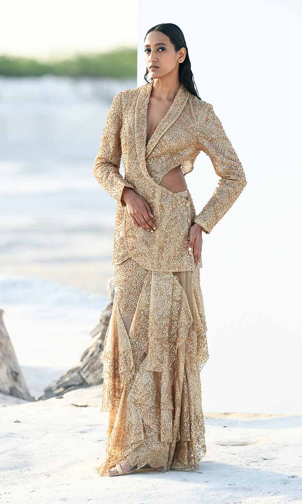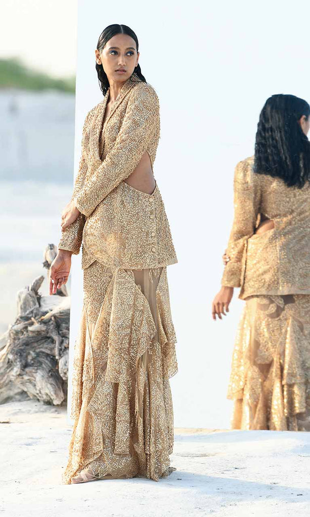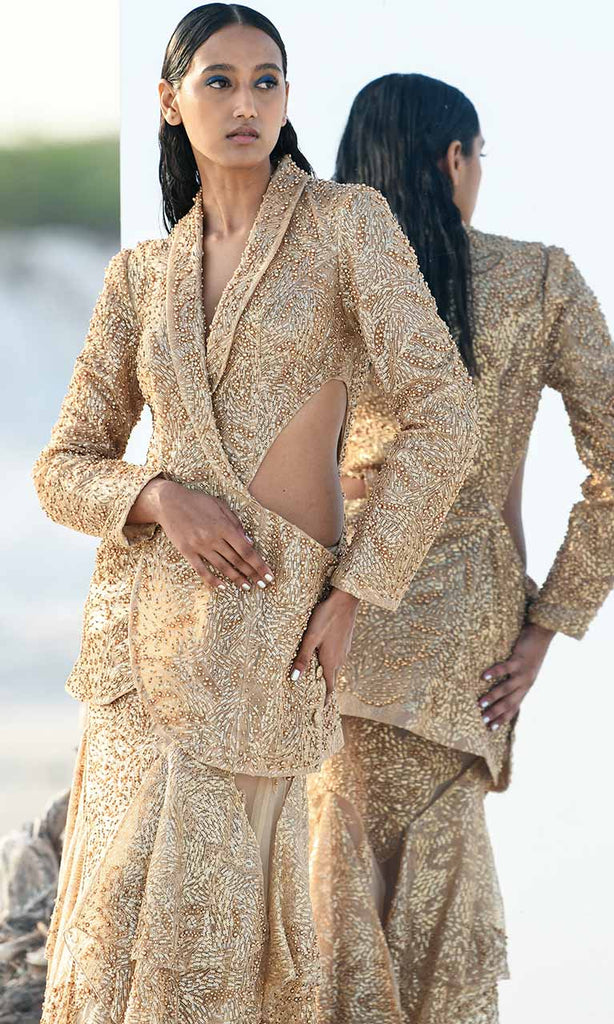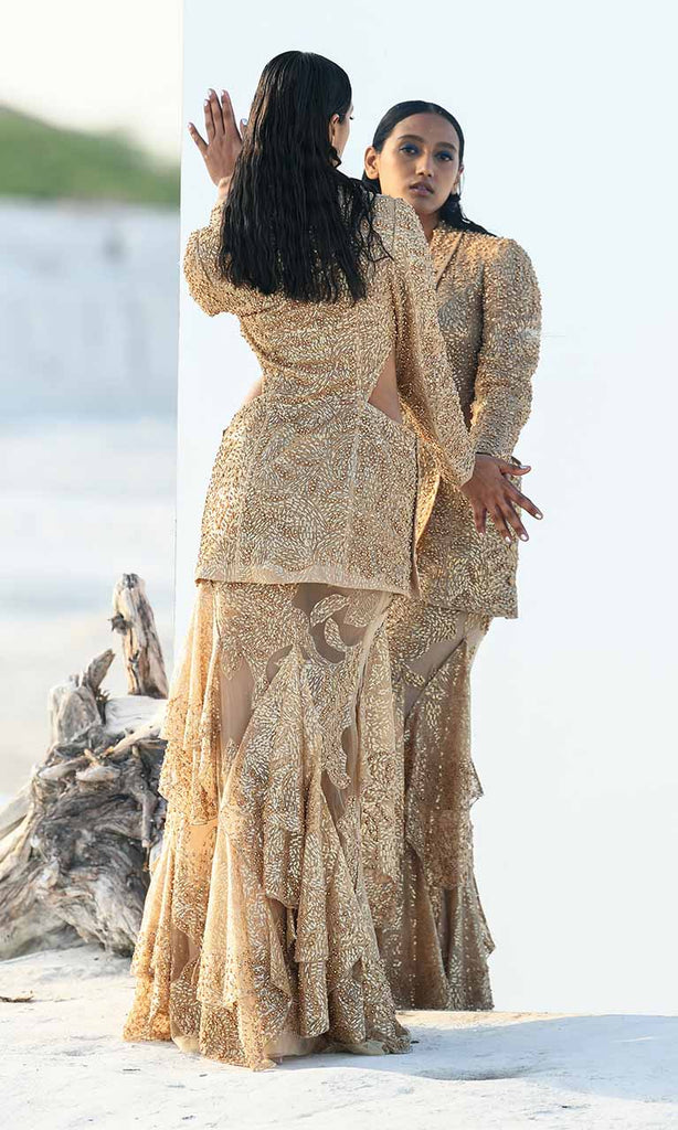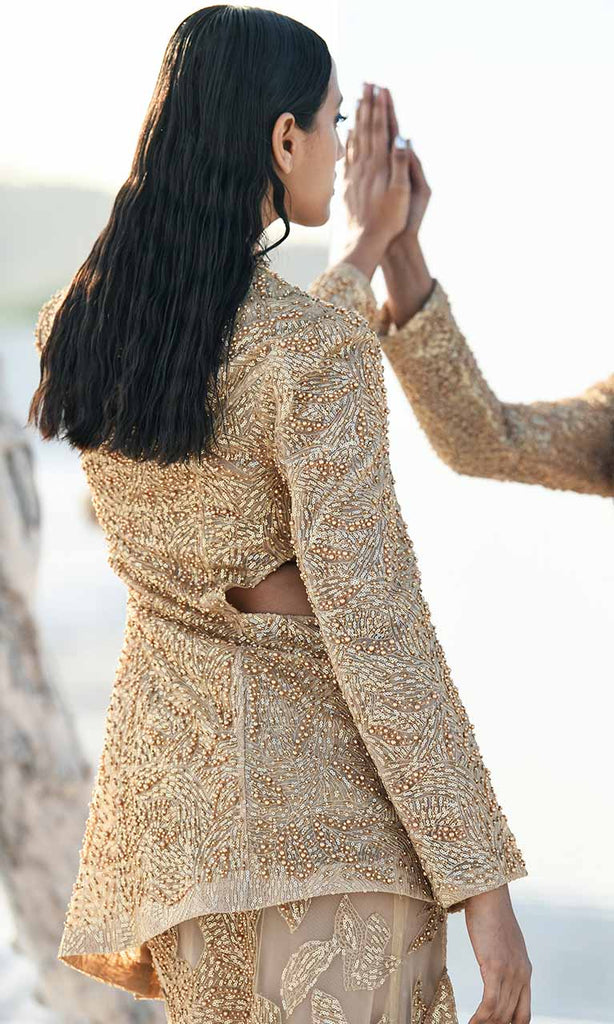 The 'Maris' set takes its inspiration from a golden sunset sea, gold is used to achieve a more refined and opulent look that is befitting for a goddess. The set features a crop blouse and a mermaid inspired skirt, the inspiration for the embroidery is derived from the motifs inspired from the sea like coral reefs and seaweed, the undulations of the sand grains and ripples of water under a golden sun, a beaded silhouette in tons of copper and gold makes this outfit all the more special.