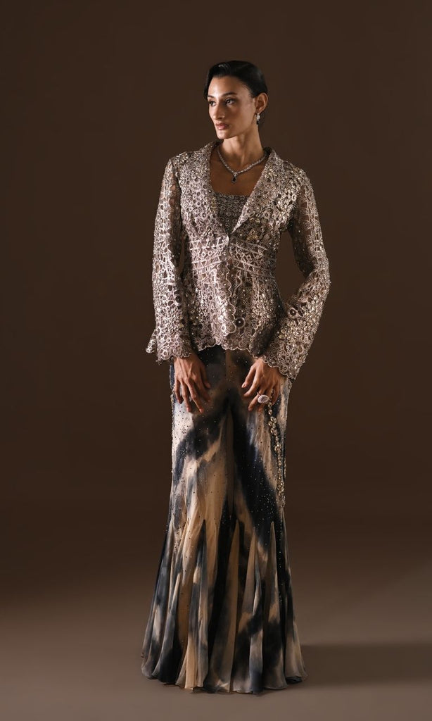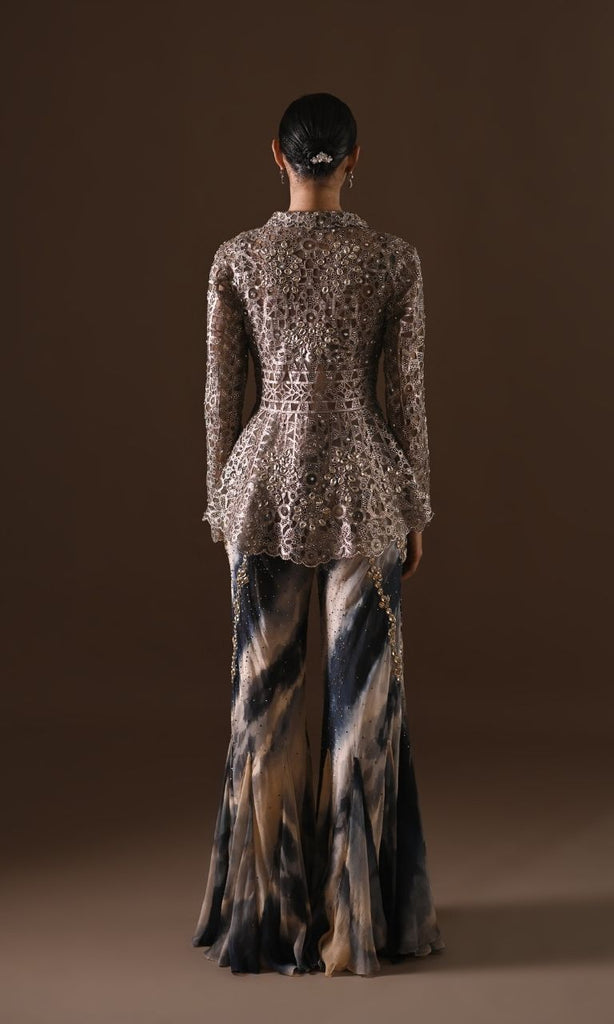 A striking set designed for the modern connoisseur of style. This luxurious look features a meticulously laser-cut, embellished jacket with a prominent collar and elegant cinched waist, paired beautifully with a cropped blouse that mirrors the jacket’s intricate detailing. Completing the set are tie-dye flared pants, also adorned with matching embellishments for a harmonious finish. Every element speaks of sophistication and artistry, offering a blend of statement design and timeless appeal, perfect for refined gatherings and special occasions.