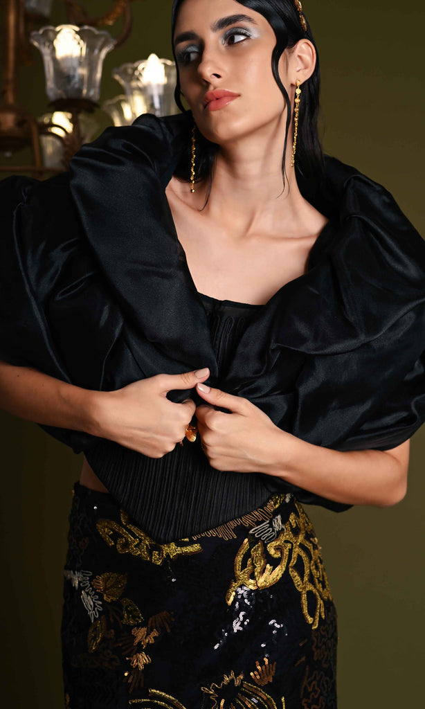The Black Solène Skirt Set is a stunning fusion of tradition and modernity, designed to make a bold statement. The intricately embroidered skirt, adorned with abstract motifs in rich gold and sage hues against a timeless black canvas, creates a captivating visual symphony. Adding avant-garde flair is the voluminous cape overlay that gracefully drapes over the corset, turning heads as you enter any room. Whether it's a fashion-forward event, gala, or contemporary wedding, this ensemble sets you apart as a trendsetter. Pair it with statement earrings, sleek, minimalist hair, and makeup for an avant-garde look, and complete it with high heels and a clutch bag in gold or sage tones to leave a lasting impression.