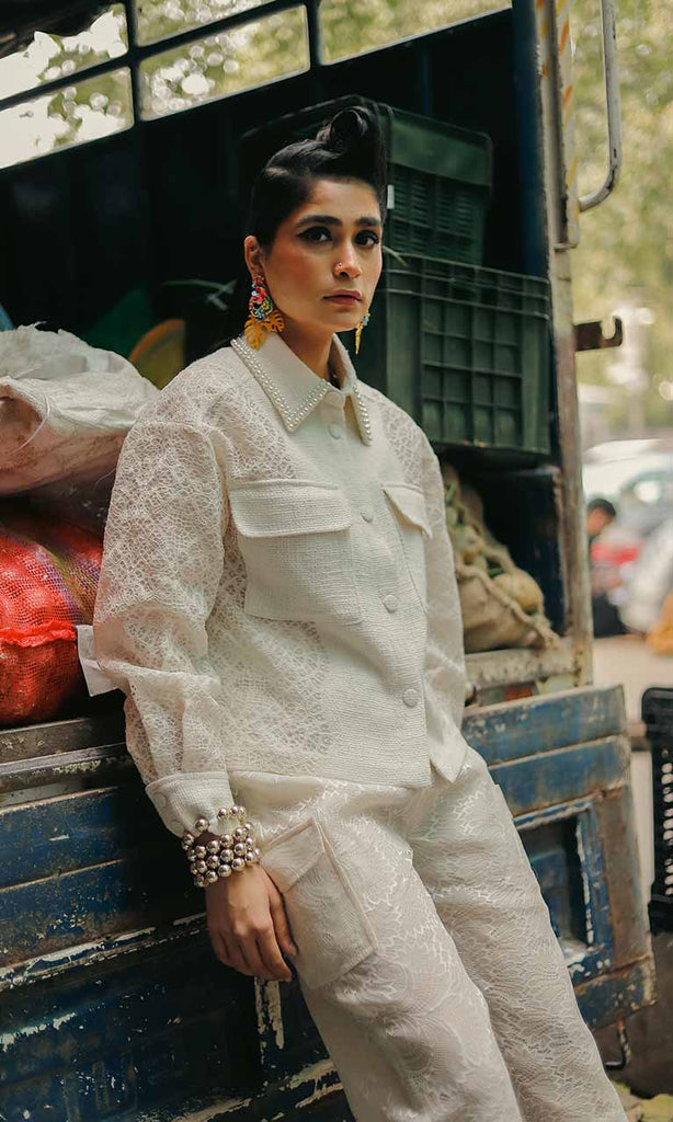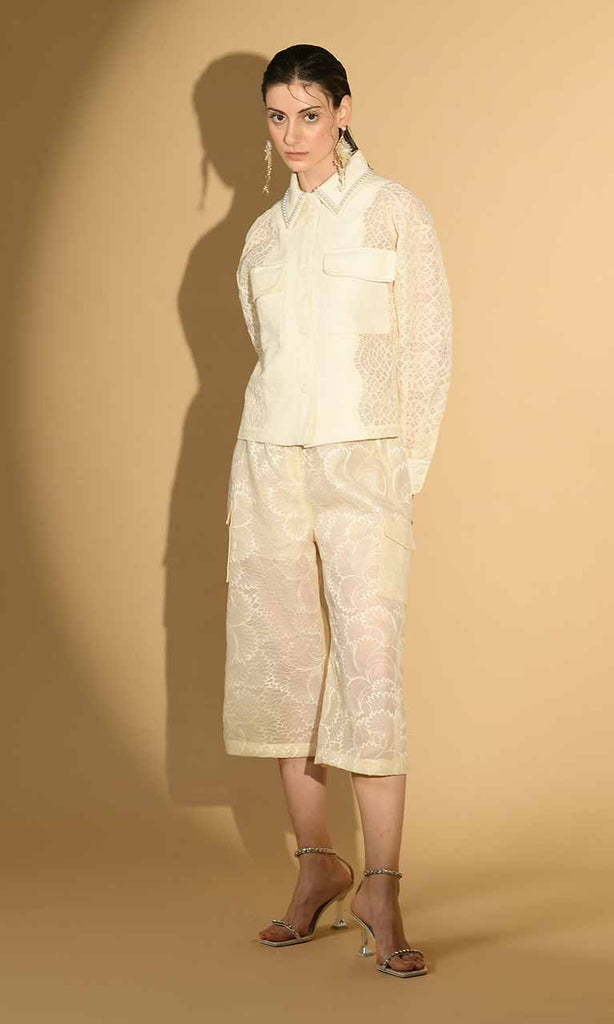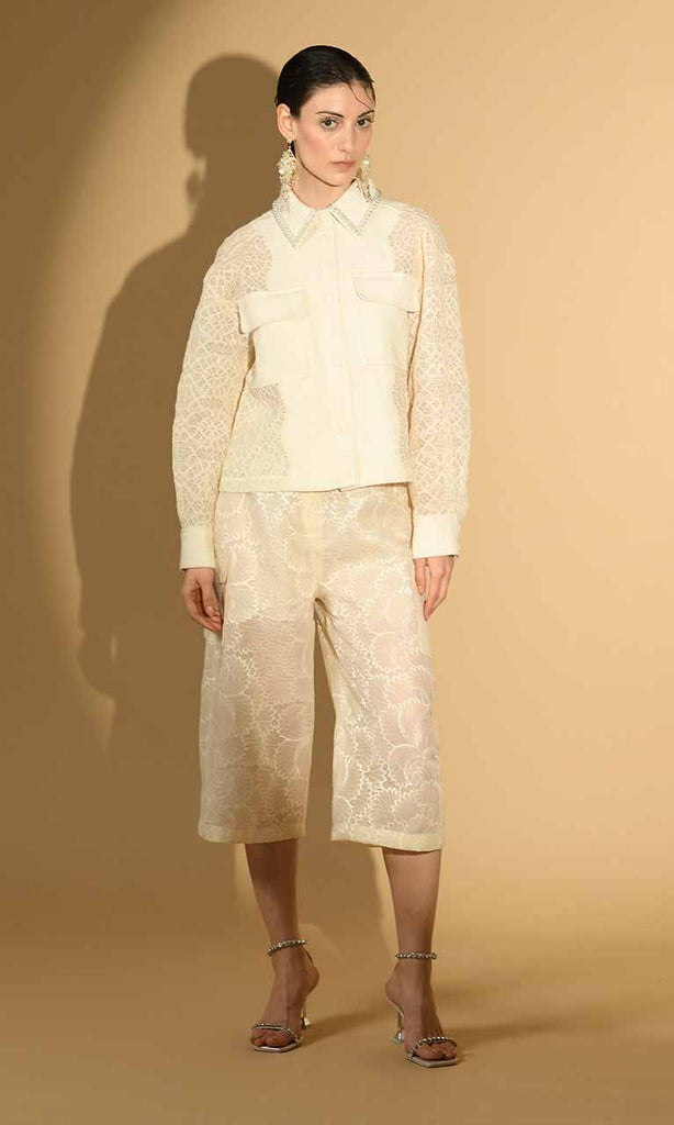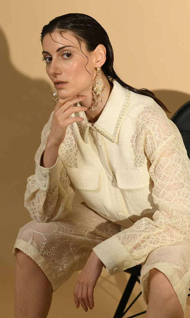 Who says that power dressing has to be all masculine and bold, it can also be relaxed and chic. As can be seen here, our 'Winona' set which features a relaxed shacket with a collar decorated with pearls and feminine bermuda pants. It is a softly powered piece for when you want to keep it a business but not too formal. Perfect for brunch settings or weekday cocktail hours, this piece will easily transition from day to night.